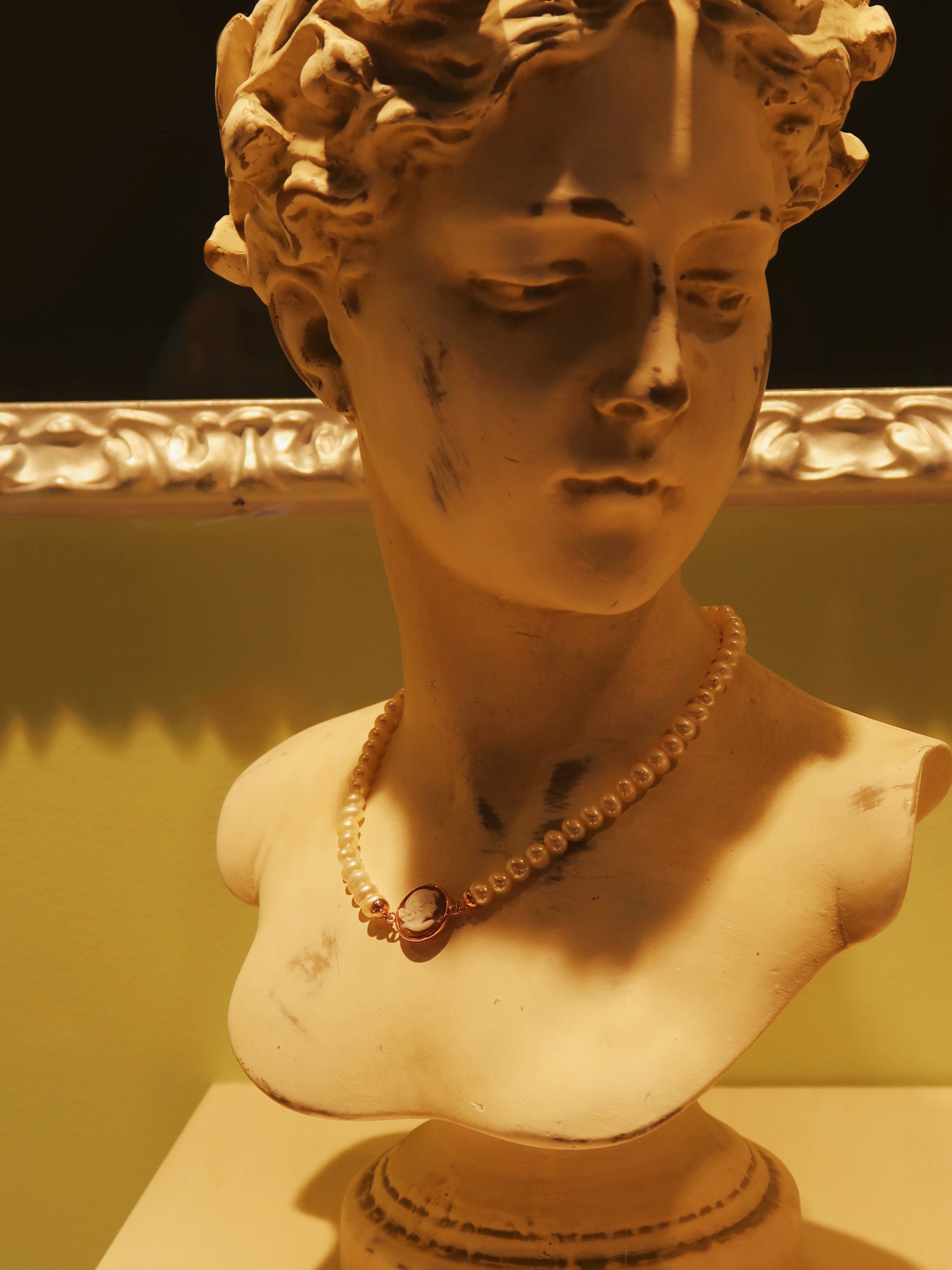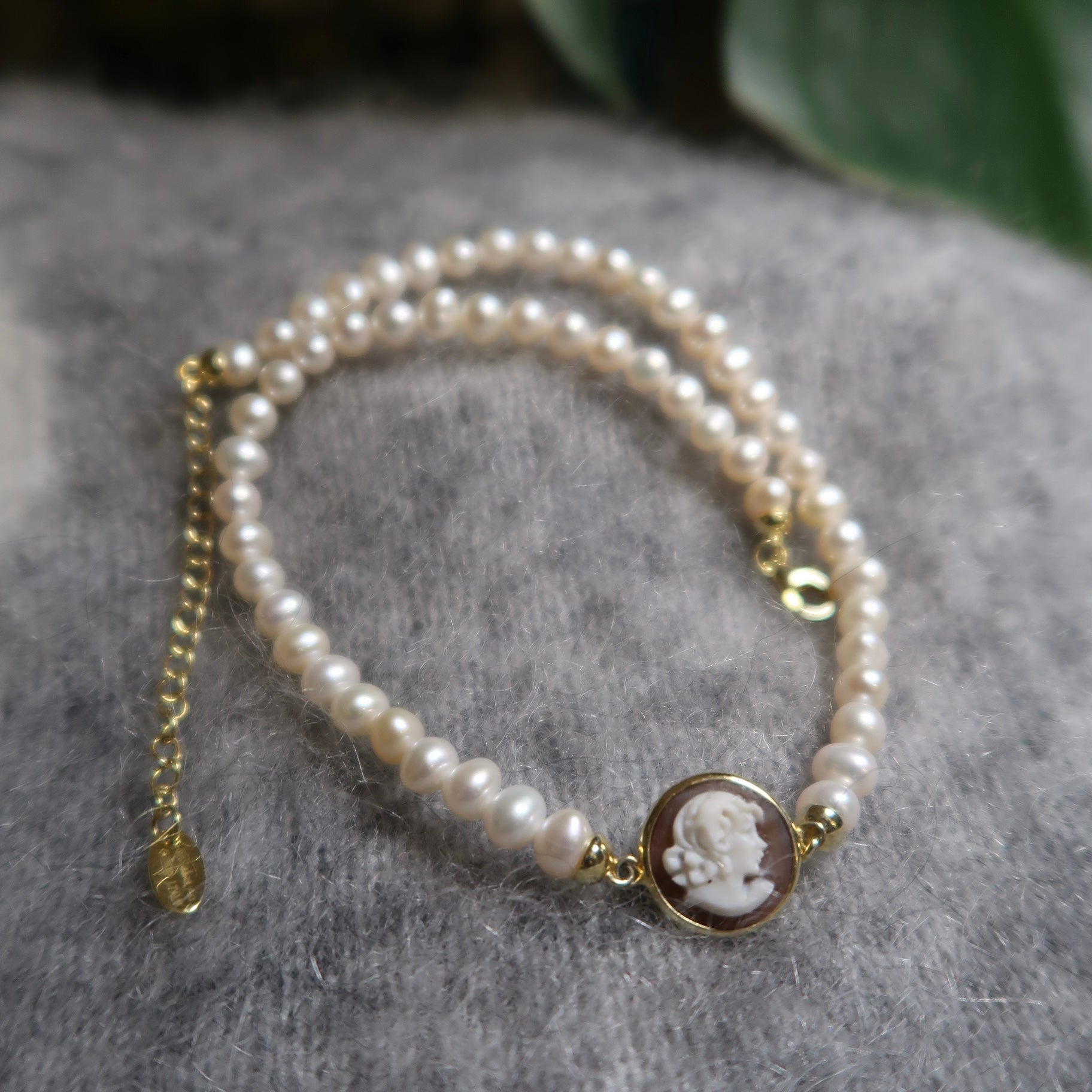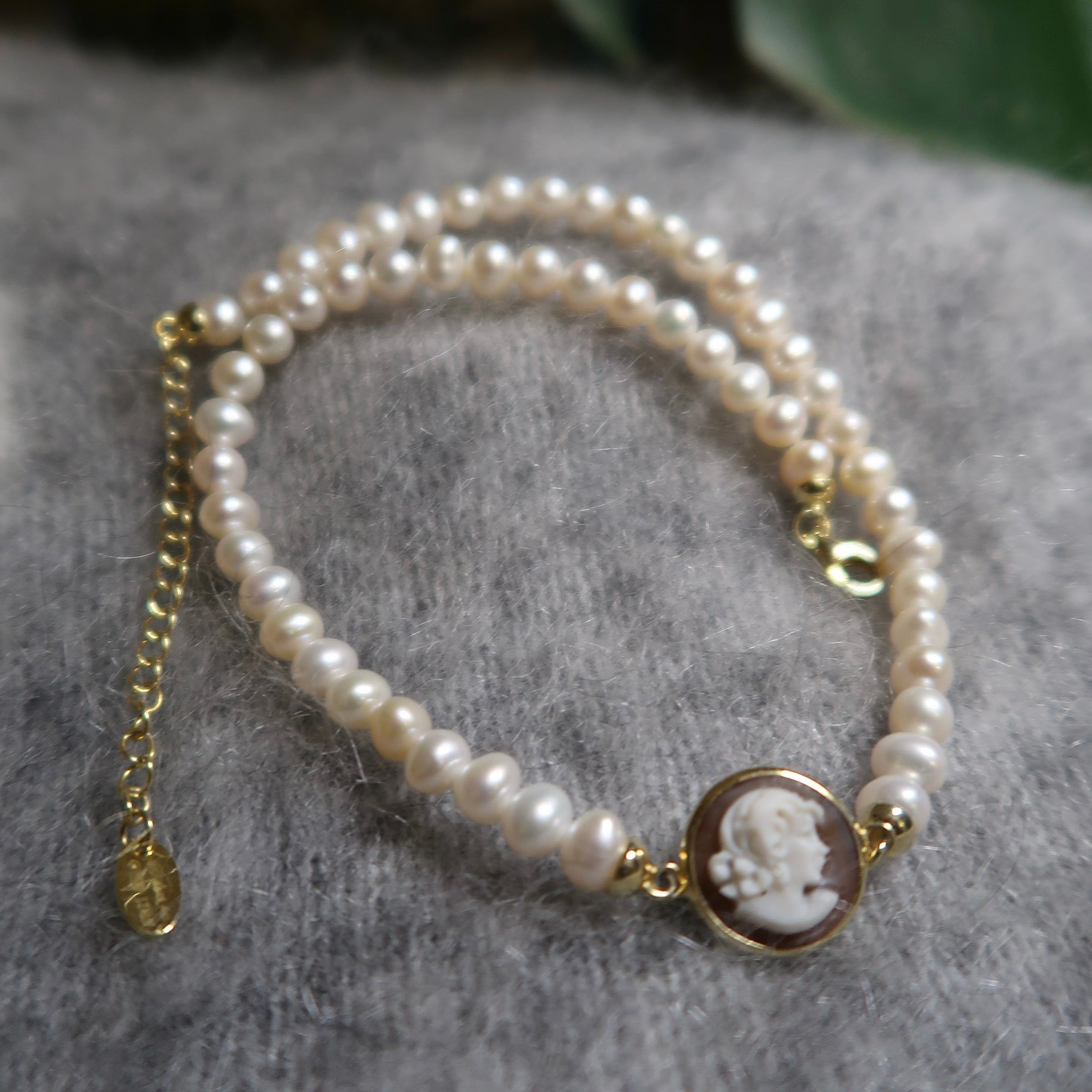 Design unique avec des perles d'eau douce ovales de 5 mm et un camée en coquillage fait main de 12 mm, longueur 15 cm avec une chaîne d'extension de 5 cm, poids 15 g.