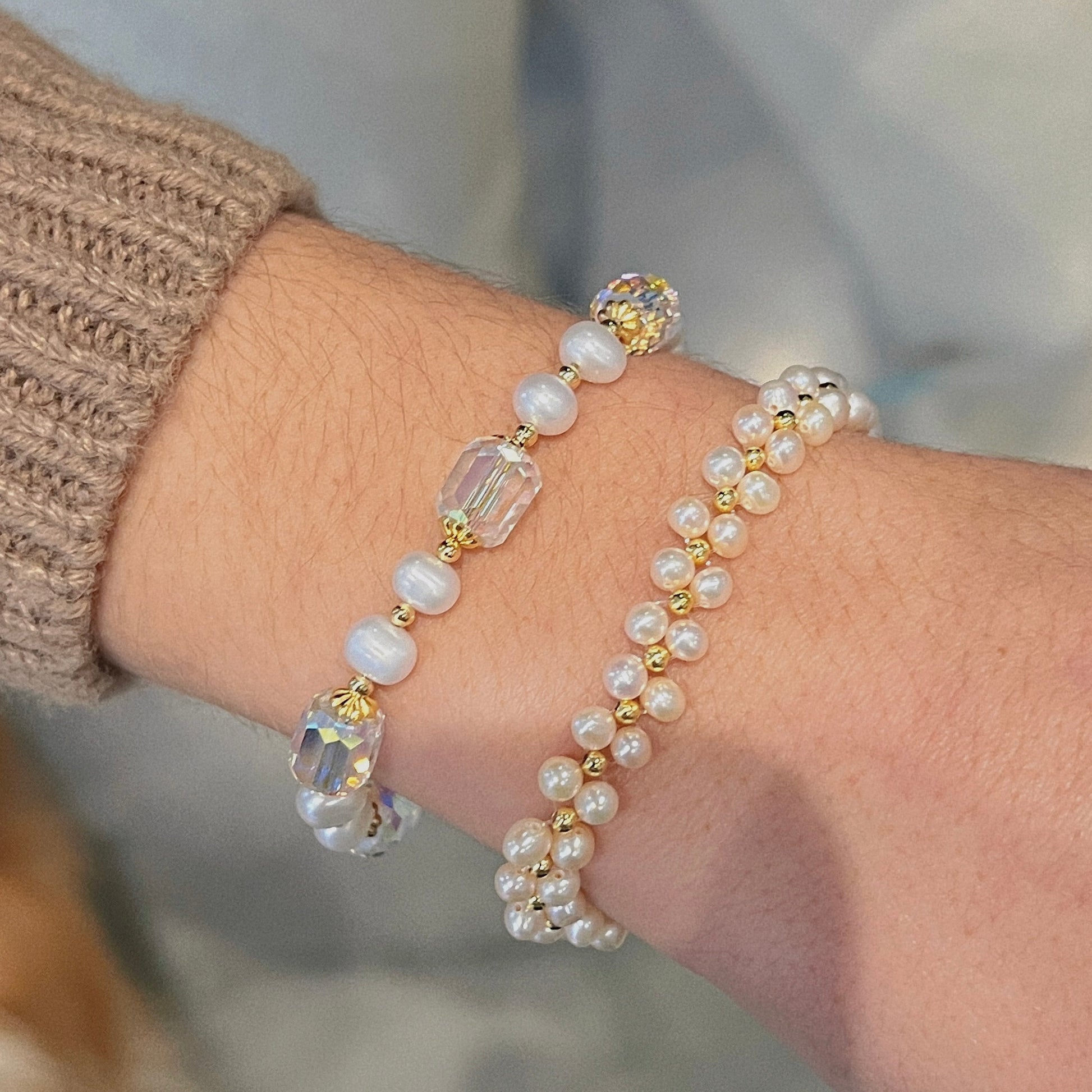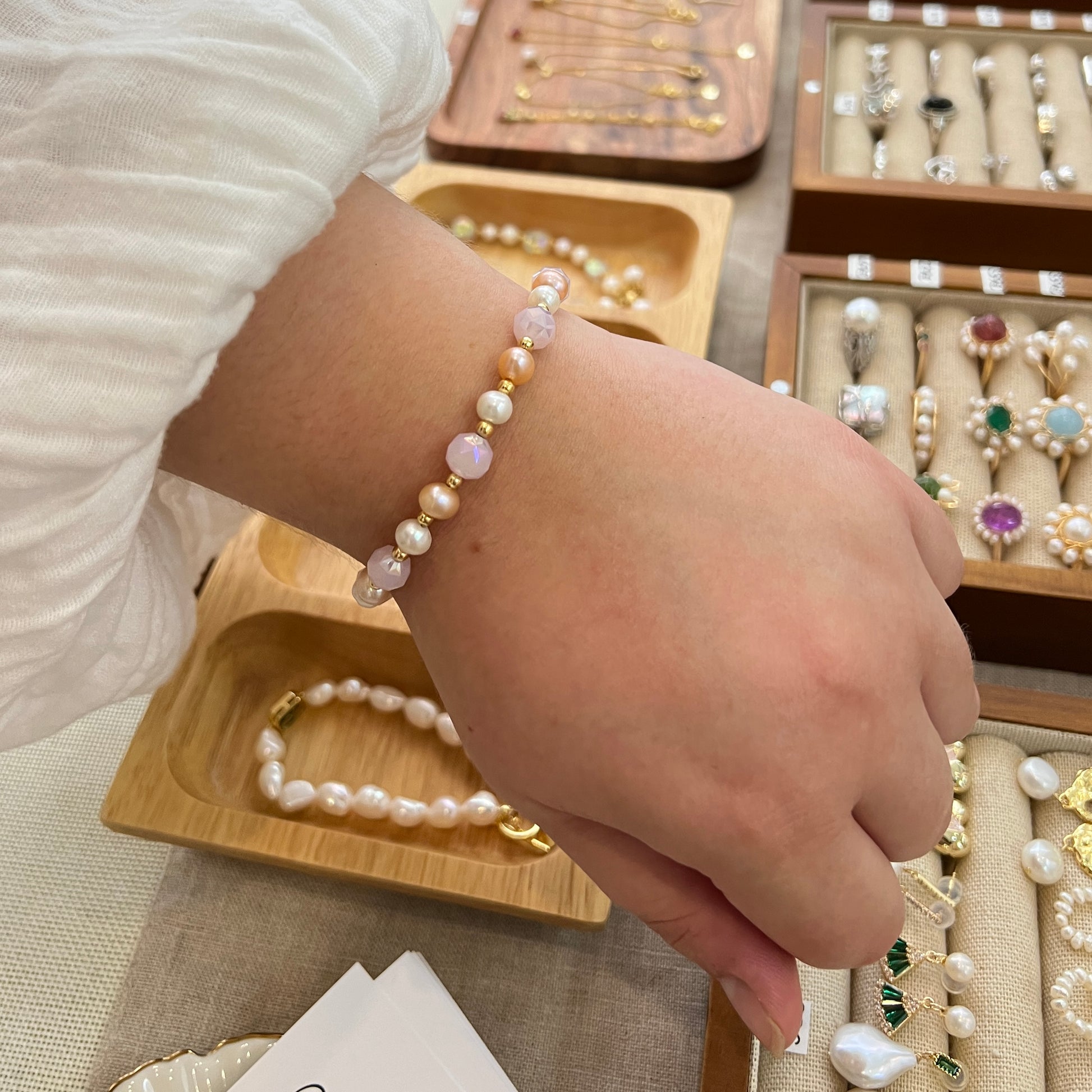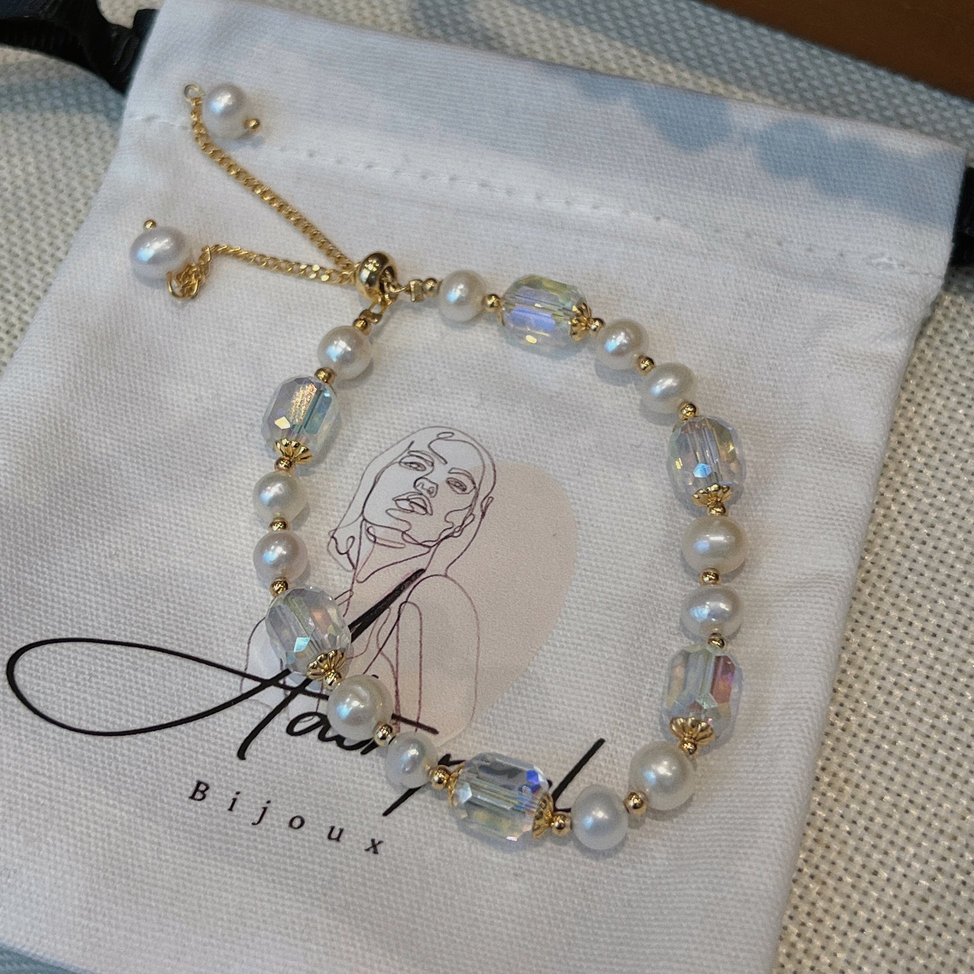 Unique design with natural pearls of 5-6mm and colored natural crystals, sterling silver material. Chain length 25cm, weight 10.8g.