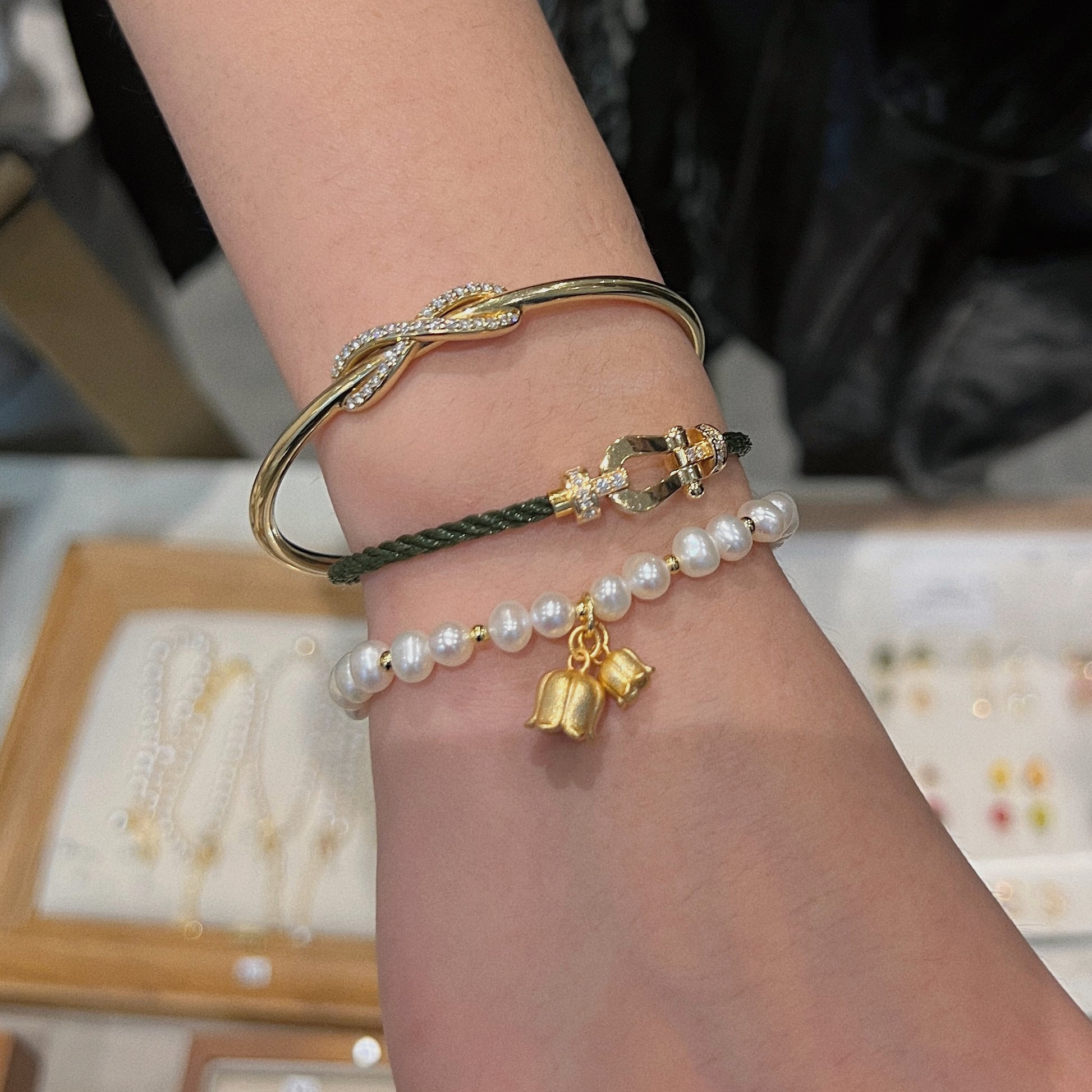 Unique design with 4-5mm natural pearls and 14K gold-filled lily of the valley accessories and small gold beads, bracelet is 16cm long plus 4cm extender chain, weighs 3g.