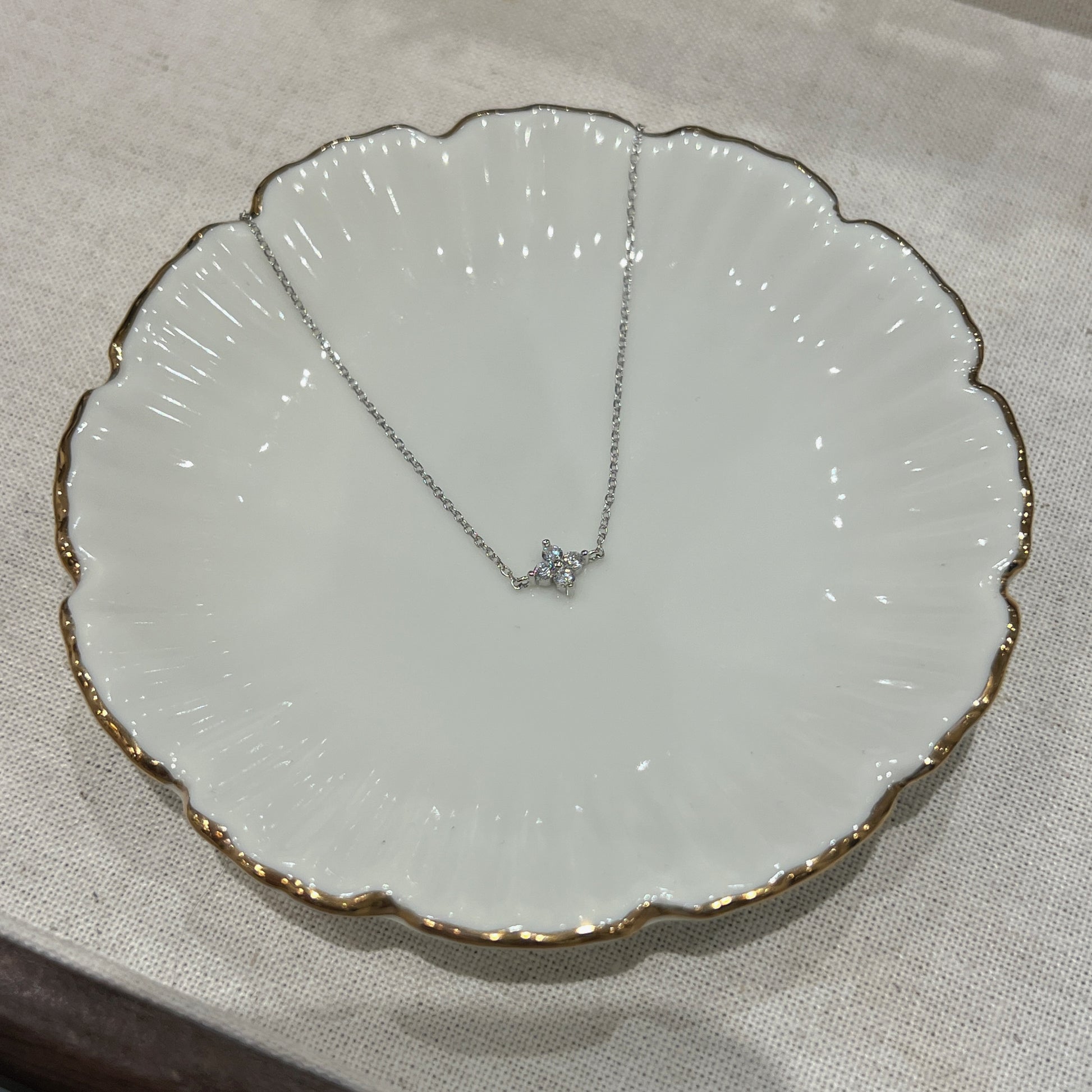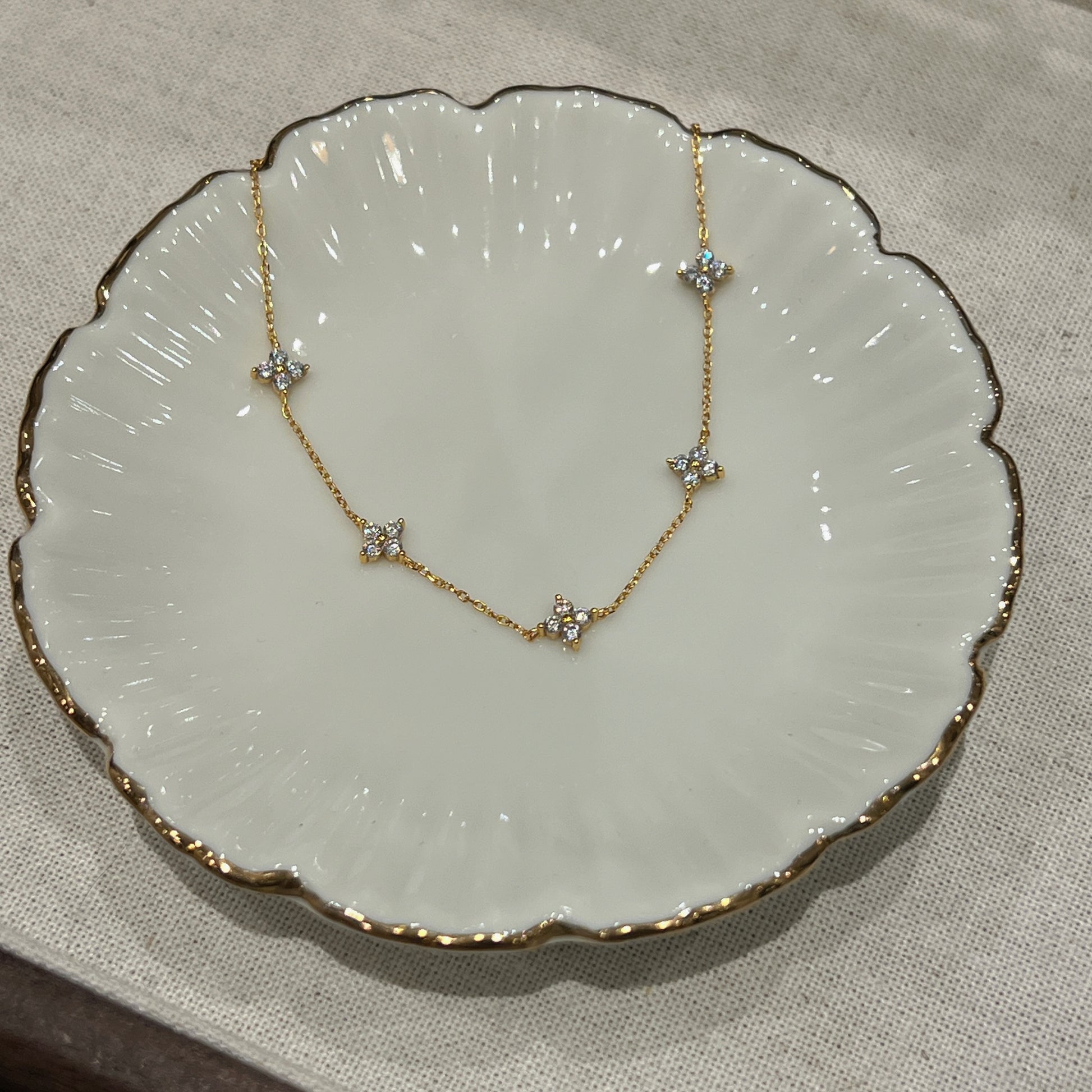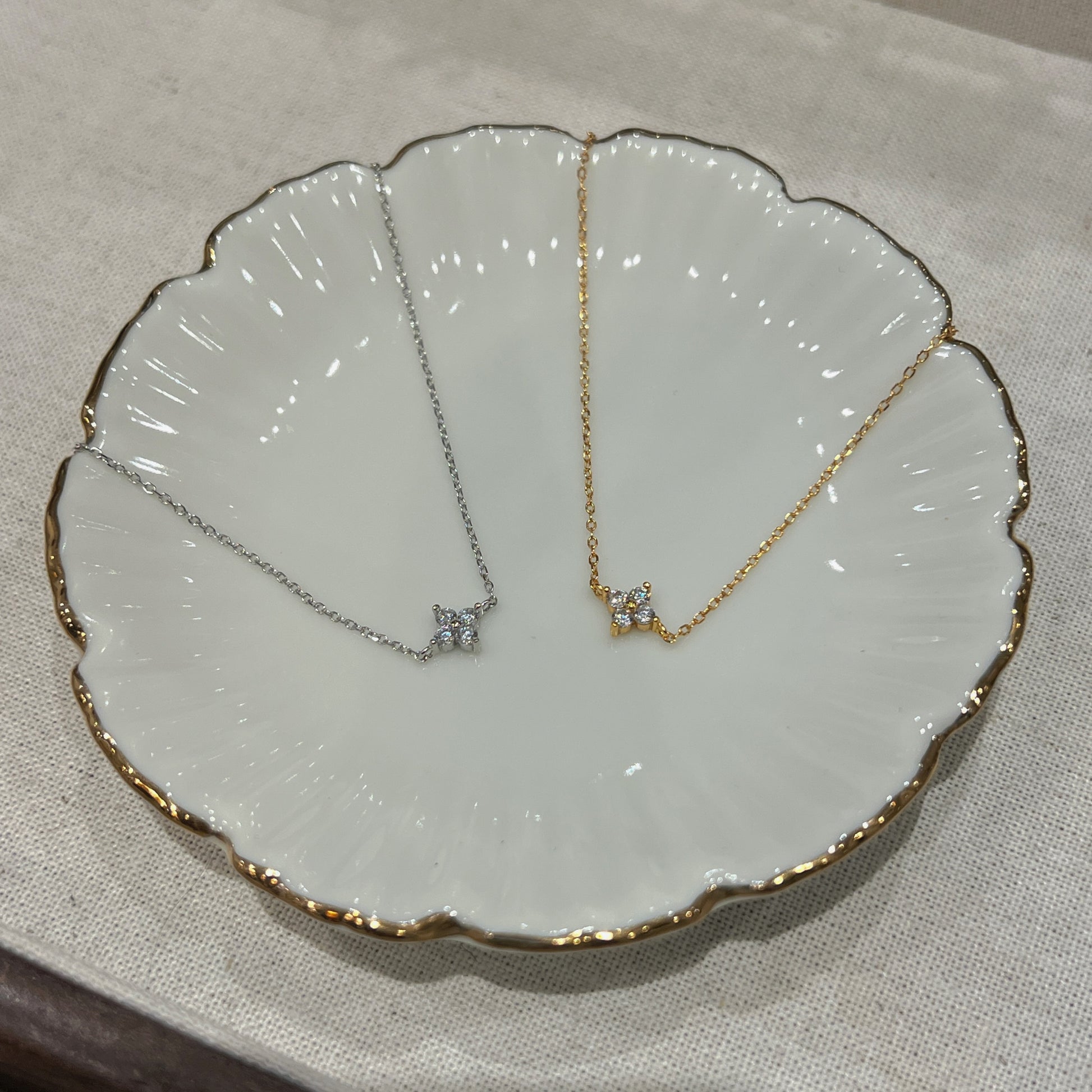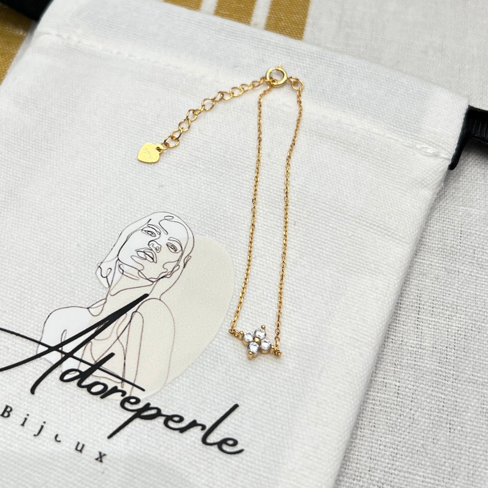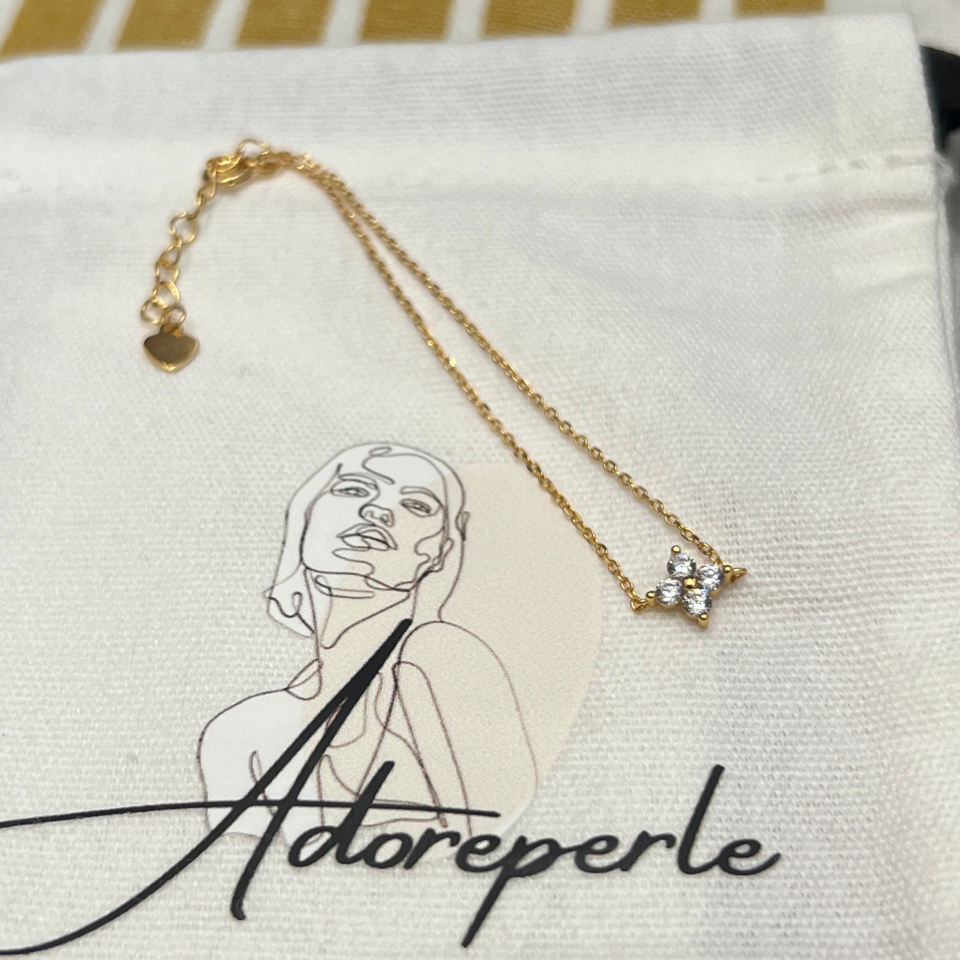 Unique minimalist design with a zircon in the shape of a four-leaf clover and gold filled 18K, sterling silver material. Diameter 7mm for the zircon and chain length 15cm with 3cm extension chain, weight 0.8g.