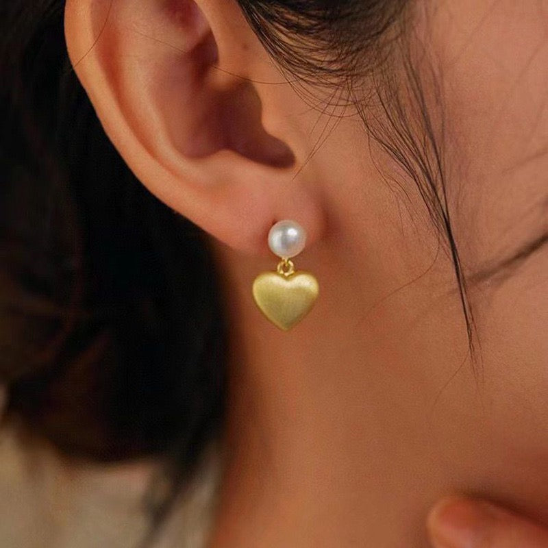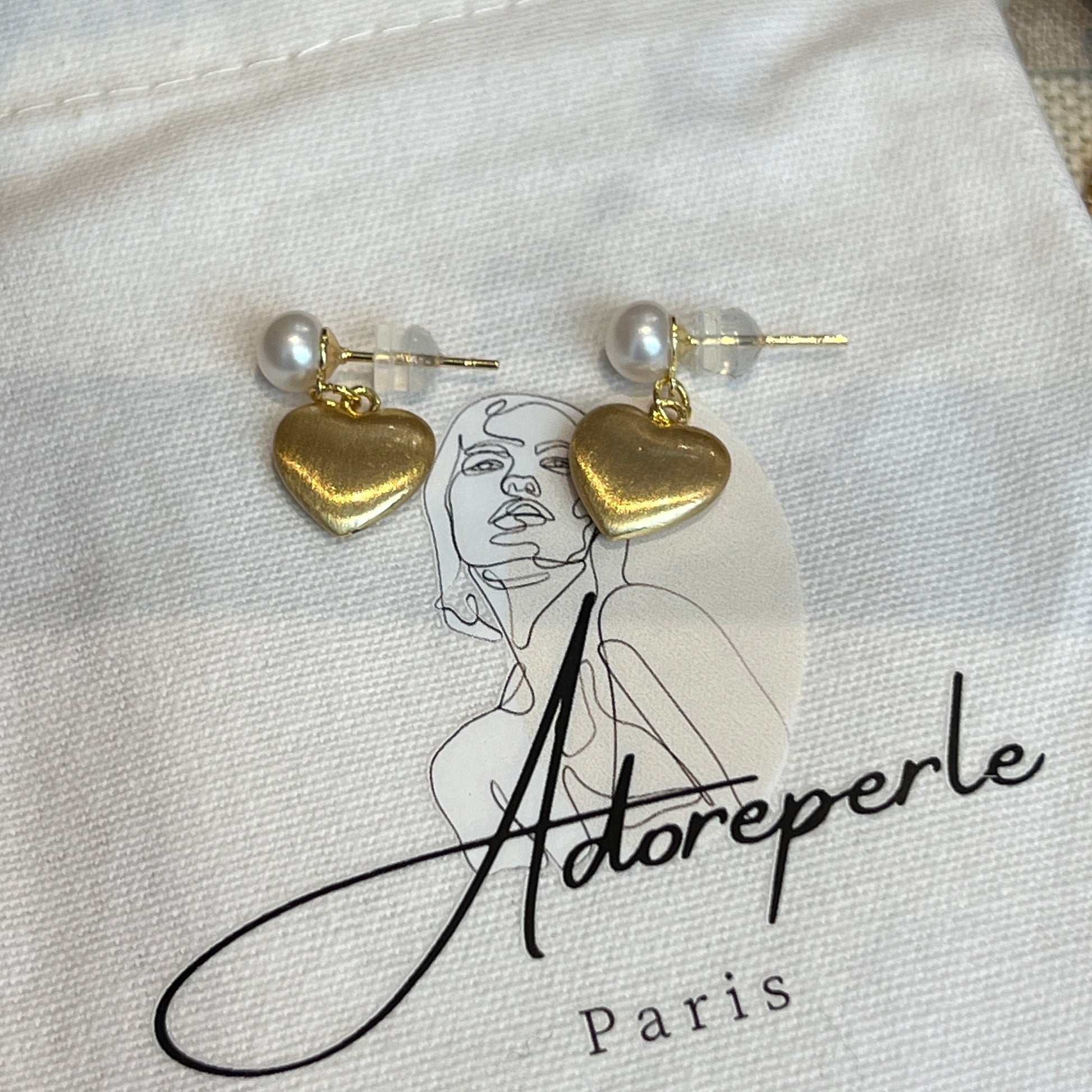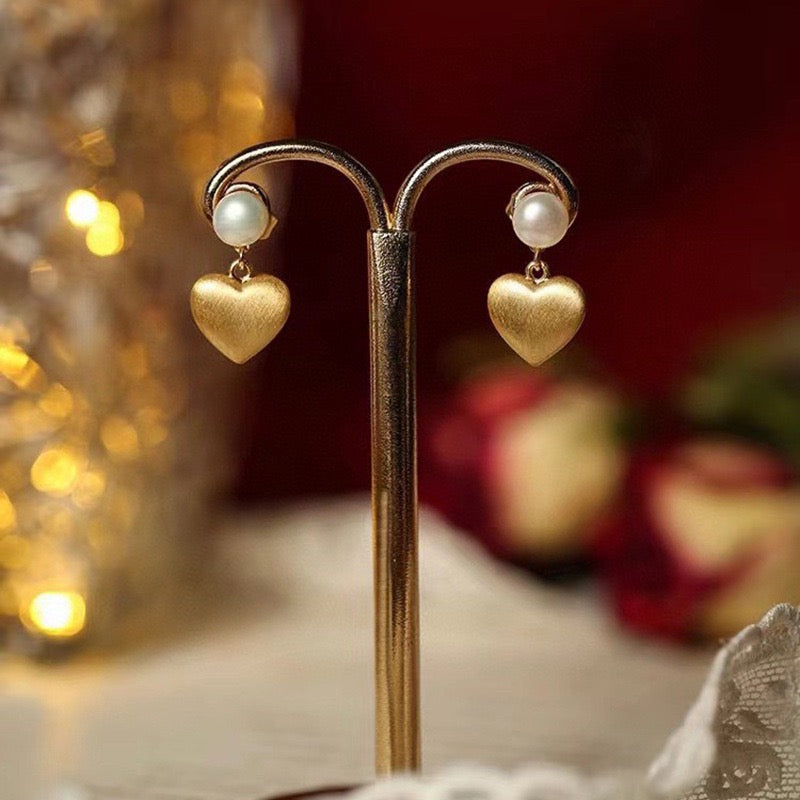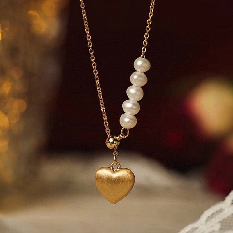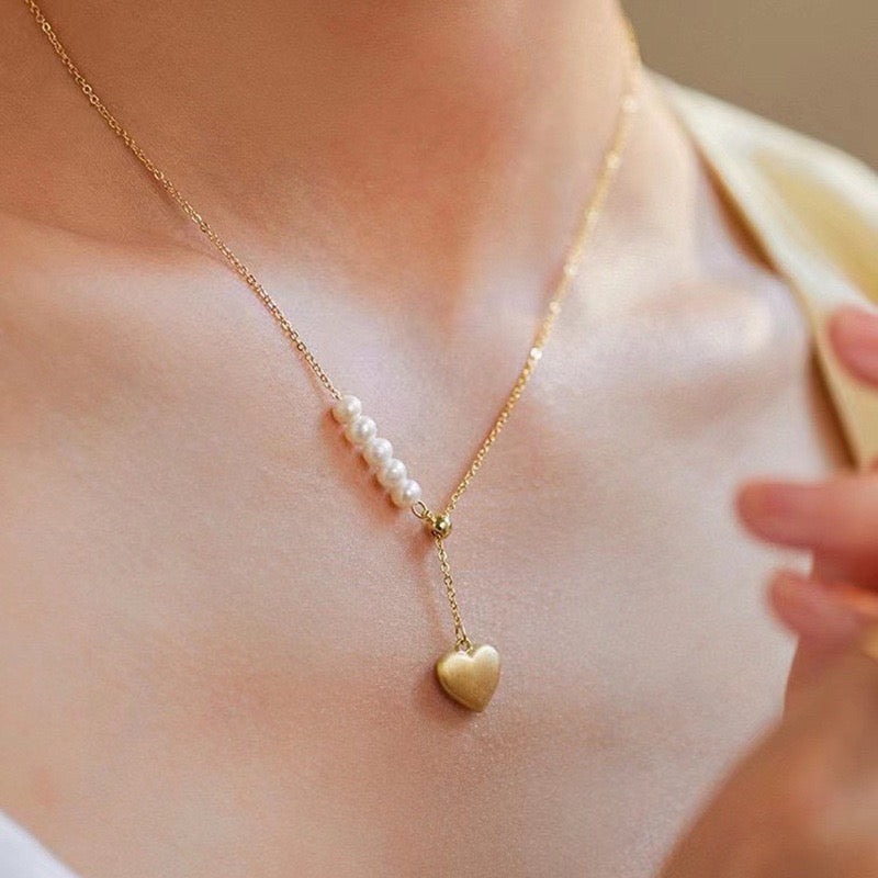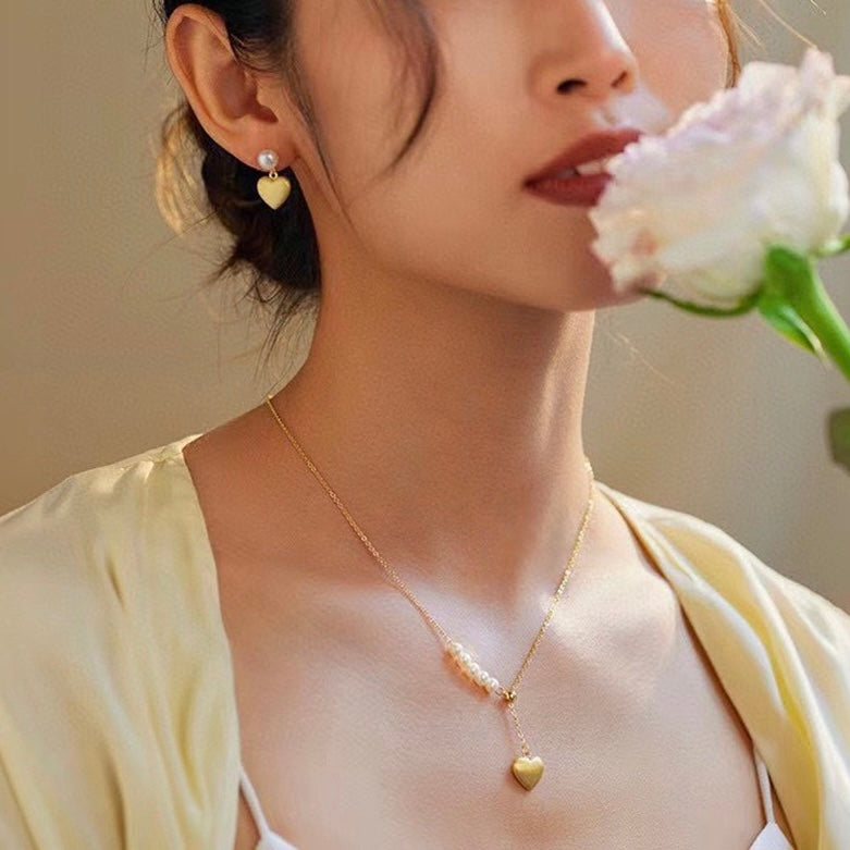 Elegant and unique vintage collection with 6-7mm natural pearls and love heart shaped 14K gold filled accessories, earrings are 925 silver ear pins and necklace chain is adjustable in length.