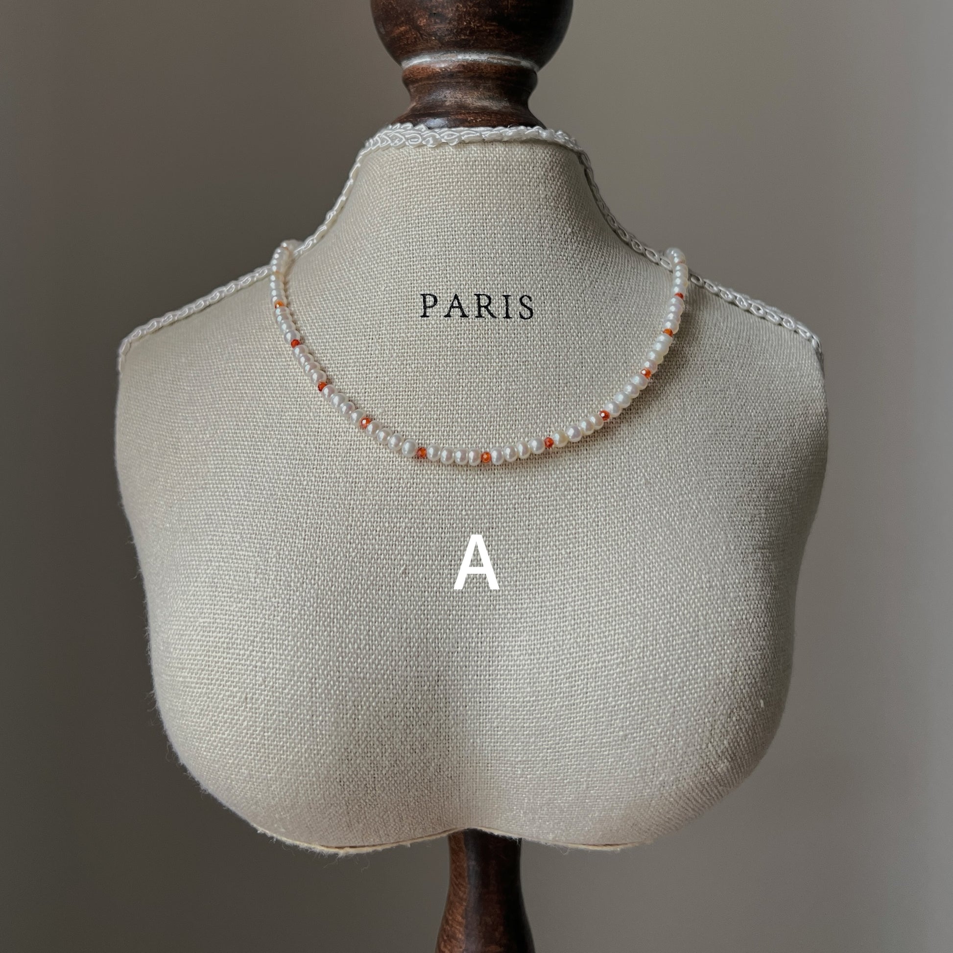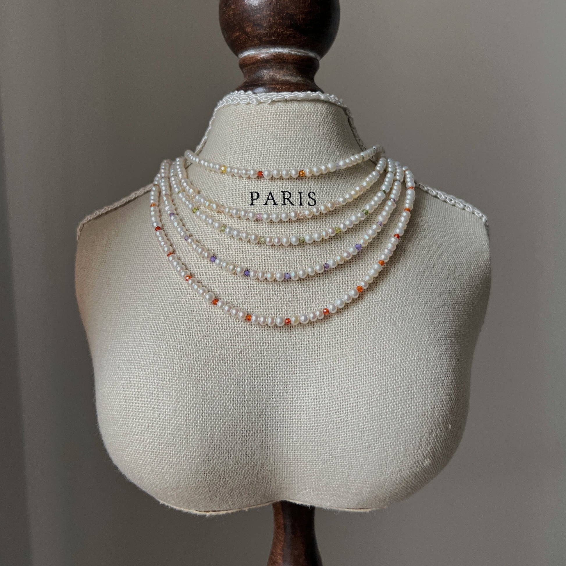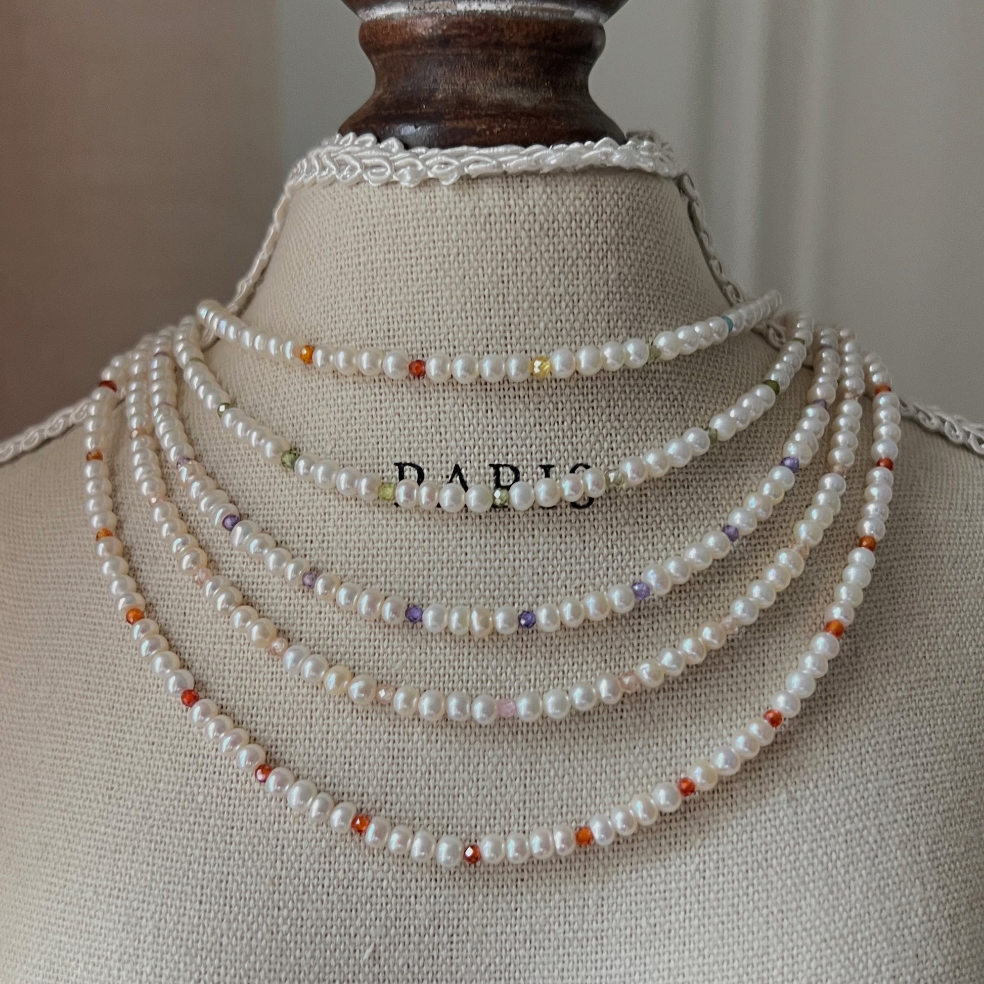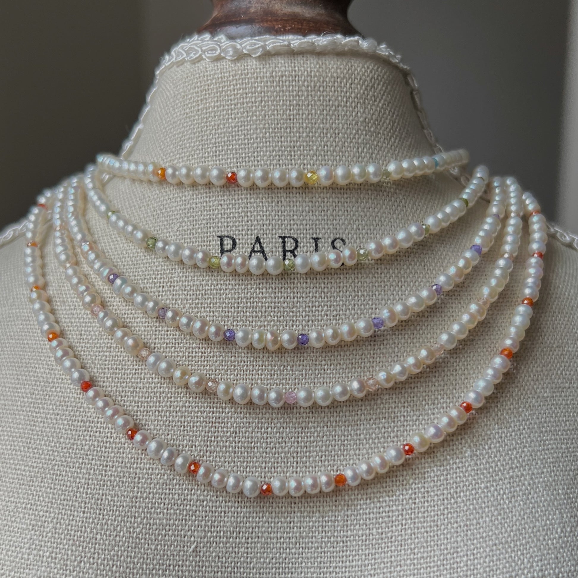 A unique collection inspired by Monet's garden, with necklaces and bracelets made from a combination of 3mm natural near-round freshwater pearls and colored zircons. The necklace is 33 cm long plus 5 cm extension chain and the bracelet is 15 cm long plus 5 cm extension chain.