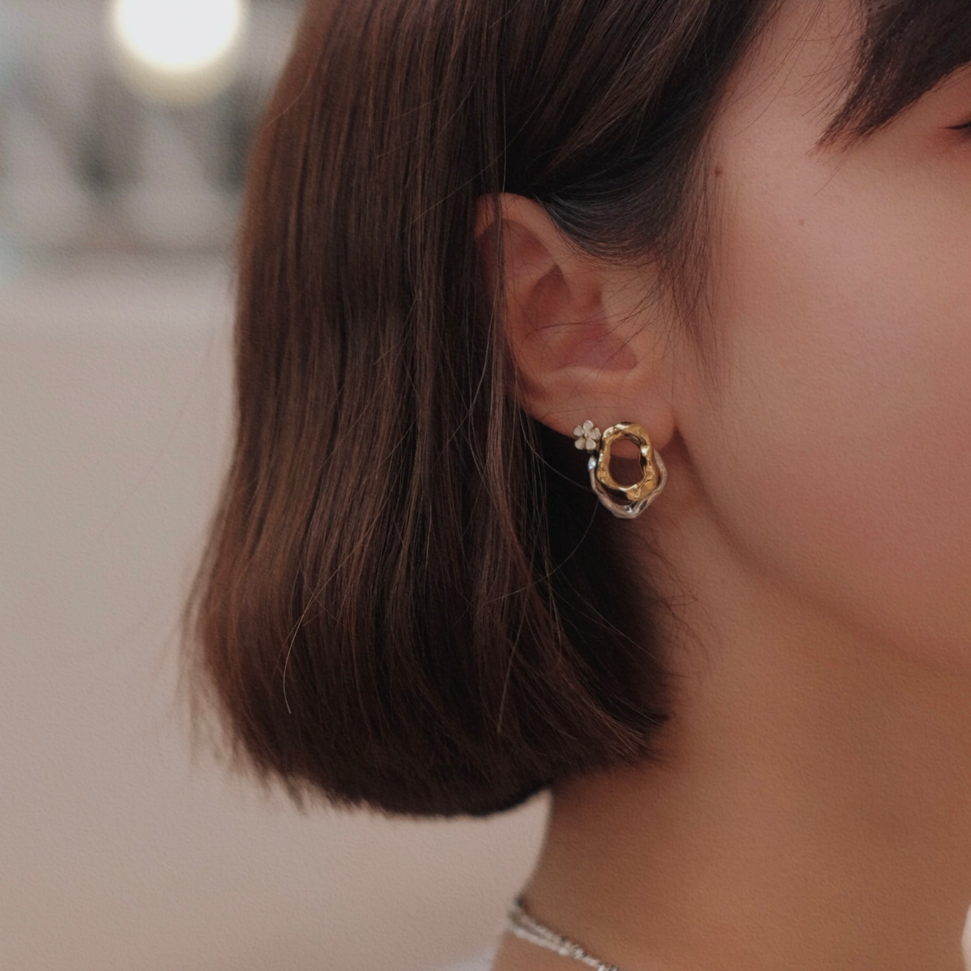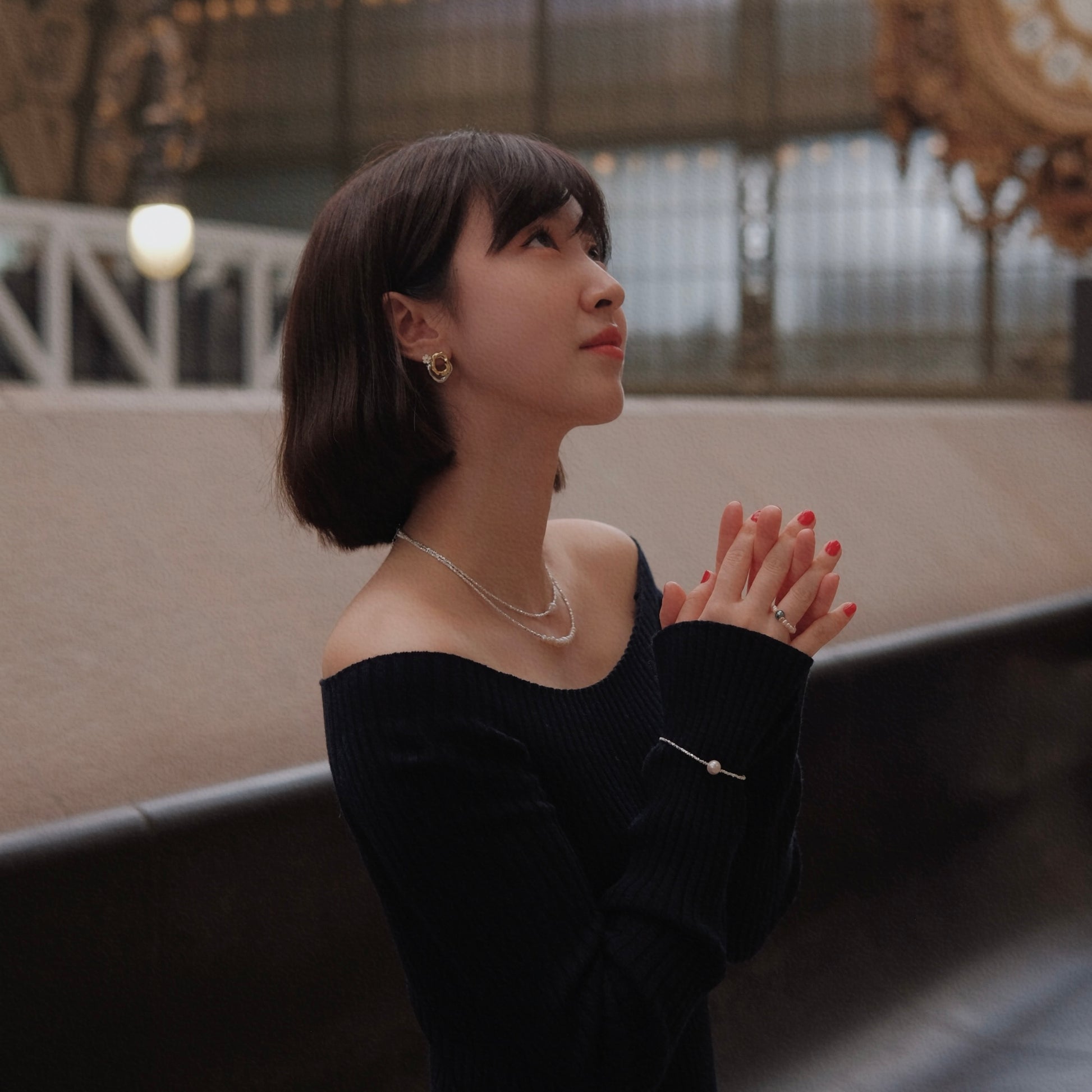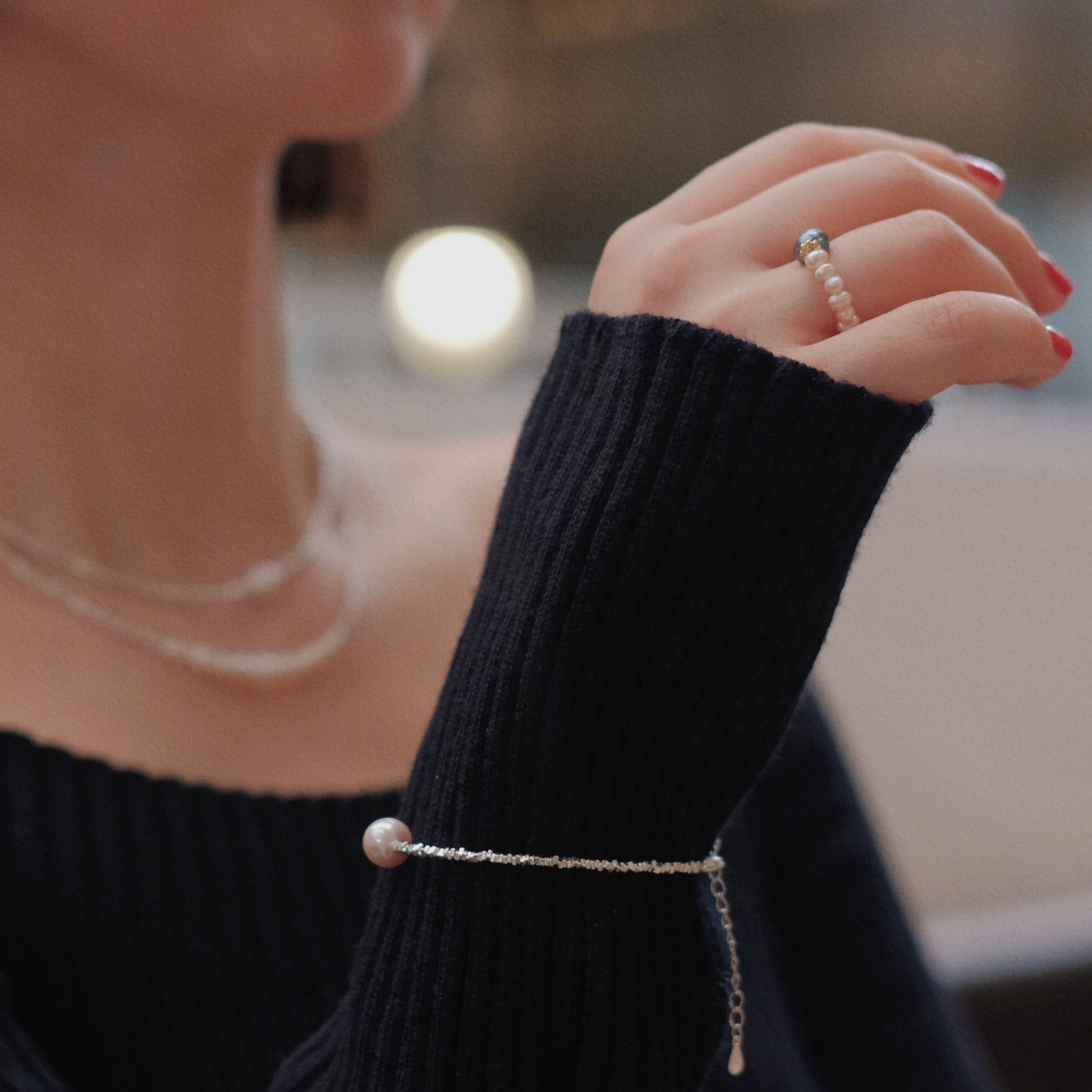 Look 1 : Unique design with 2 in 1 necklace in natural pearls of 3-4mm and stainless steels, pearl necklace length 33cm and stainless steels necklace length 38cm, weight 18g. Earrings with rose accessories and natural baroque pearls of 10-12mm, length 3cm, 925 silver pin, individual weight 2.5g. 3 unique rings in S925 and natural pearls of 2-3mm, size adjustable.