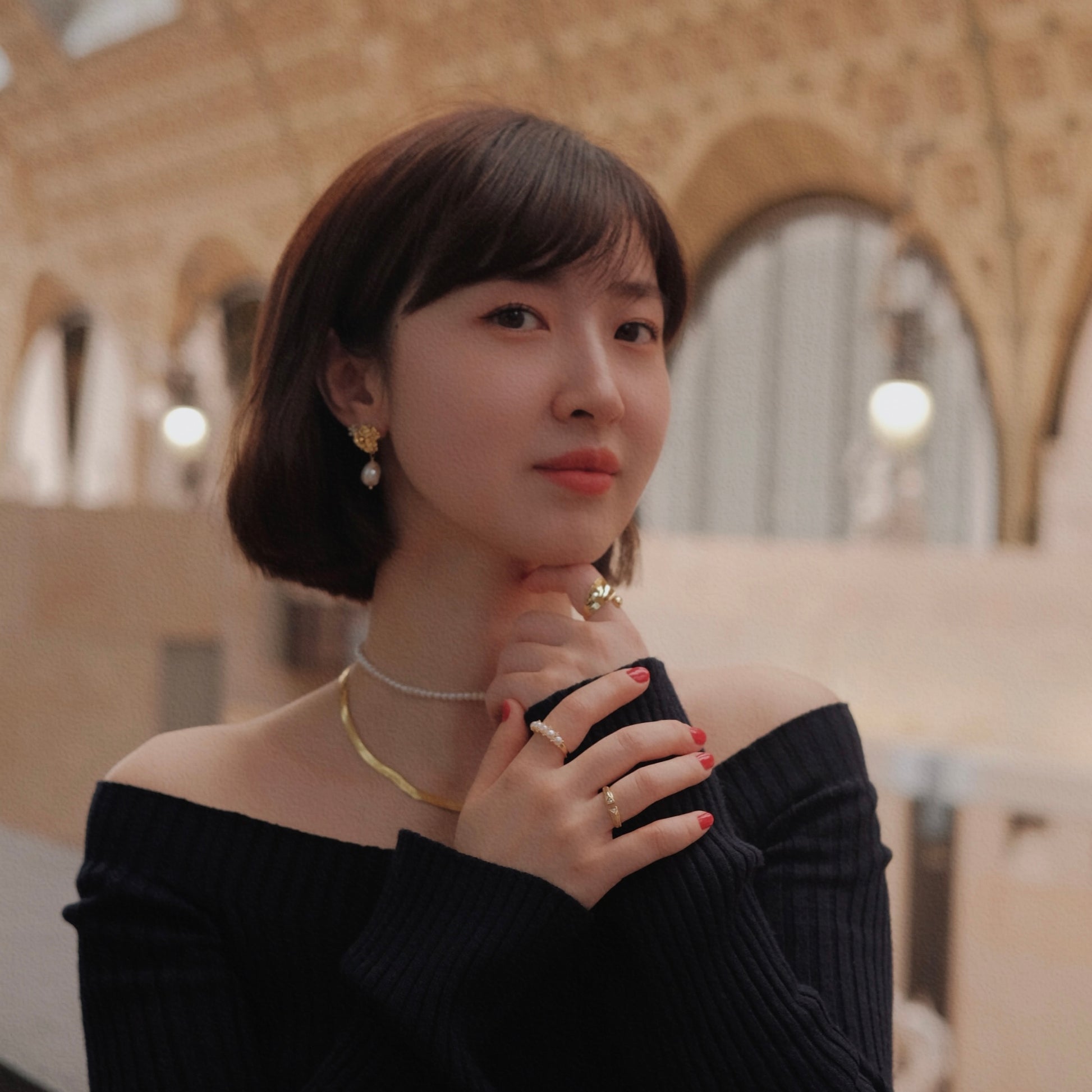 Look 3 : Unique design with one necklace in natural pearls of 3-8mm and cute accessories in S925 and another necklace in one natural pearl of 9-10mm and cute accessories in S925, necklace length 38cm with 5cm extender chain, weight 15g. Bracelet in one natural pearl of 9-10mm and cute accessories in S925, bracelet length 16cm with 4cm extender chain. Earrings 2 in 1 with gold plated 18K, length 2cm, 925 silver pin. Pearl ring with natural pearls of 2mm and one dark blue natural pearl of 4mm.