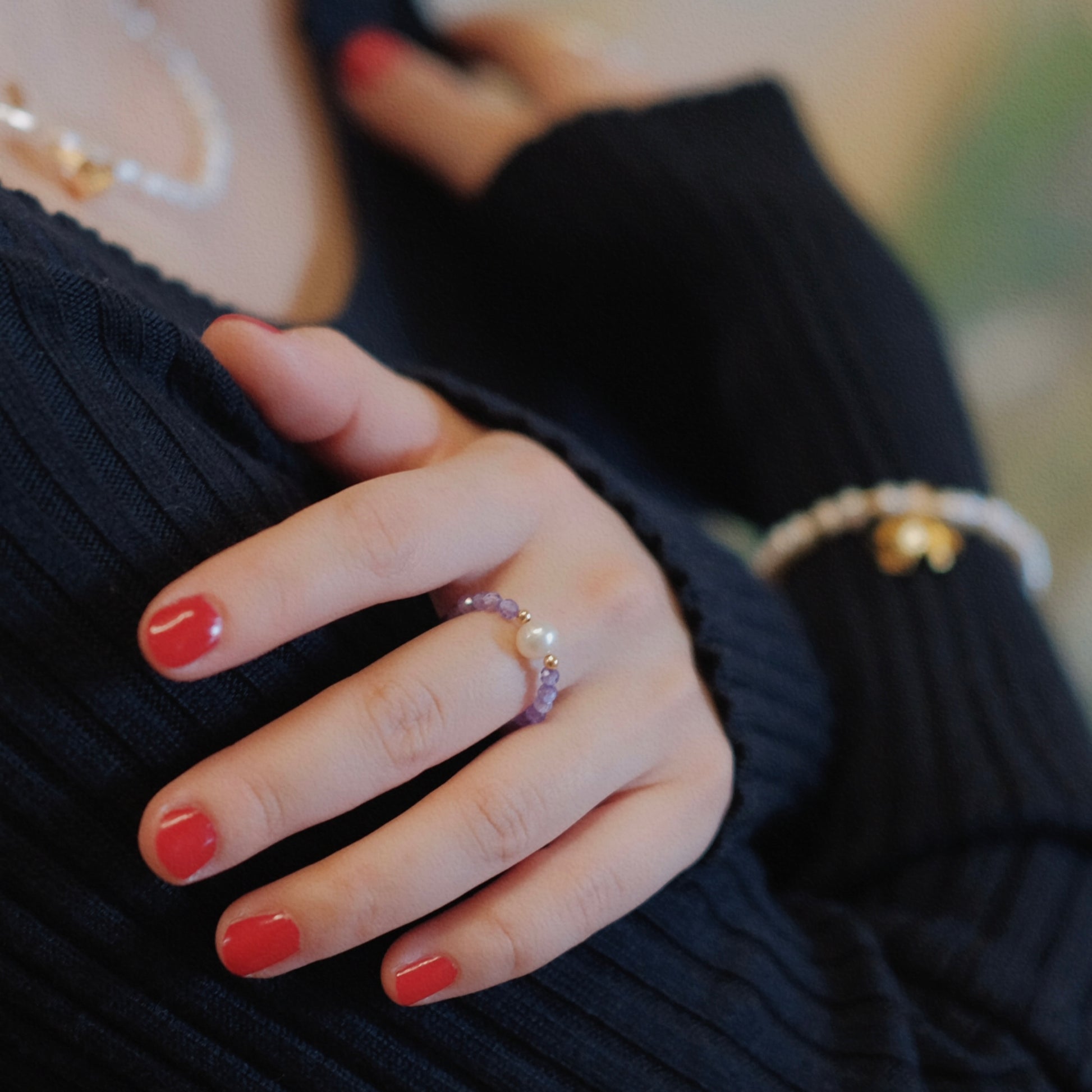 Look 2 : Unique design with drop-shaped natural pearls of 5-6mm and a rose accessory in gold plated 14K, necklace length 40cm, weight 18g. Romantic earrings with rose accessoires and purple natural pearls of 10-11mm, length 2cm, 925 silver pin. One ring with a natural purple pearl of 4-5mm and S925, size adjustable, another ring with a natural pearl and purple crystals. Bracelet with 4-5mm natural pearls and 14K gold-filled lily of the valley accessories and small gold beads, bracelet is 16cm long plus 4cm extender chain, weighs 3g.