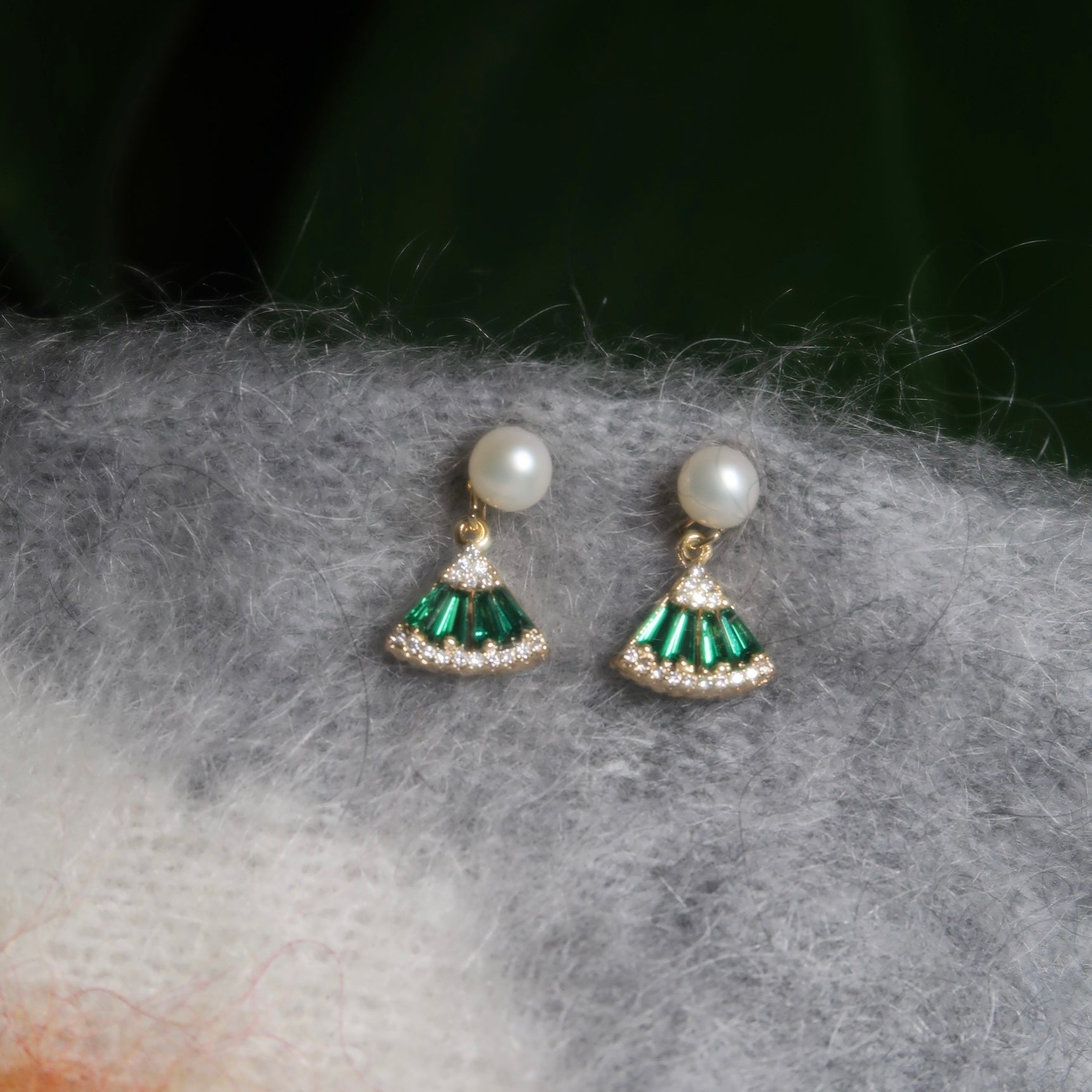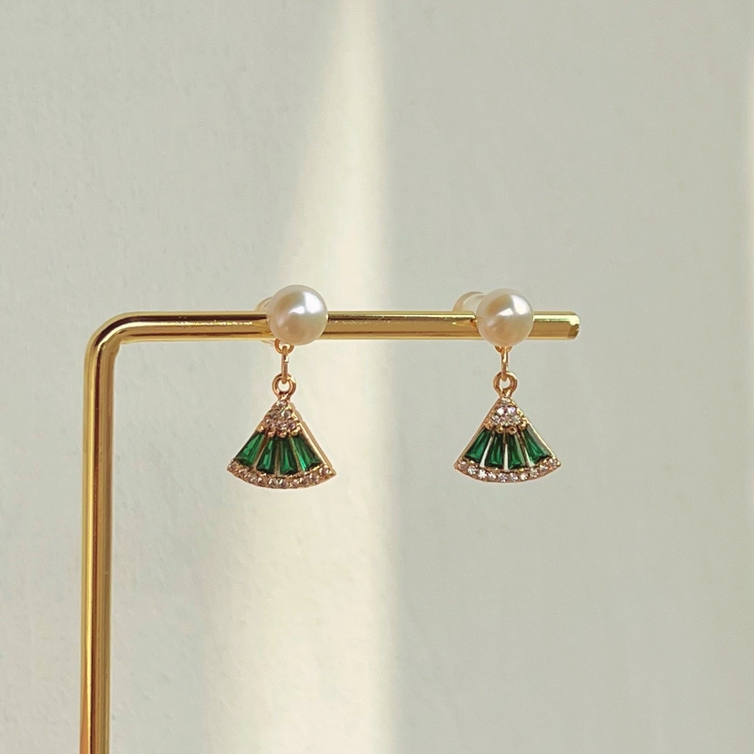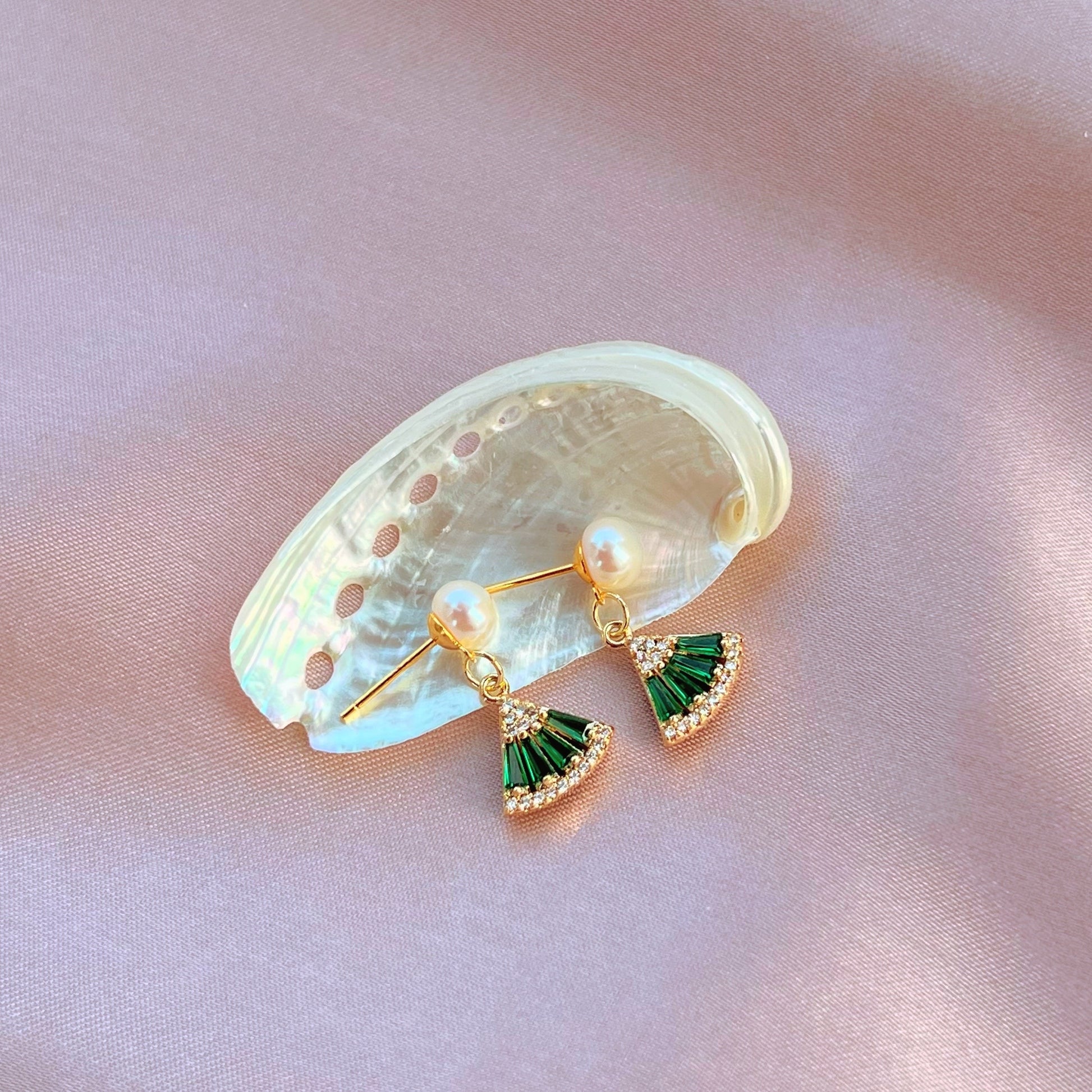 Unique design with natural pearl of 5-6mm and Fan-shaped green zircon, 925 silver pin, individual weight 1.5g