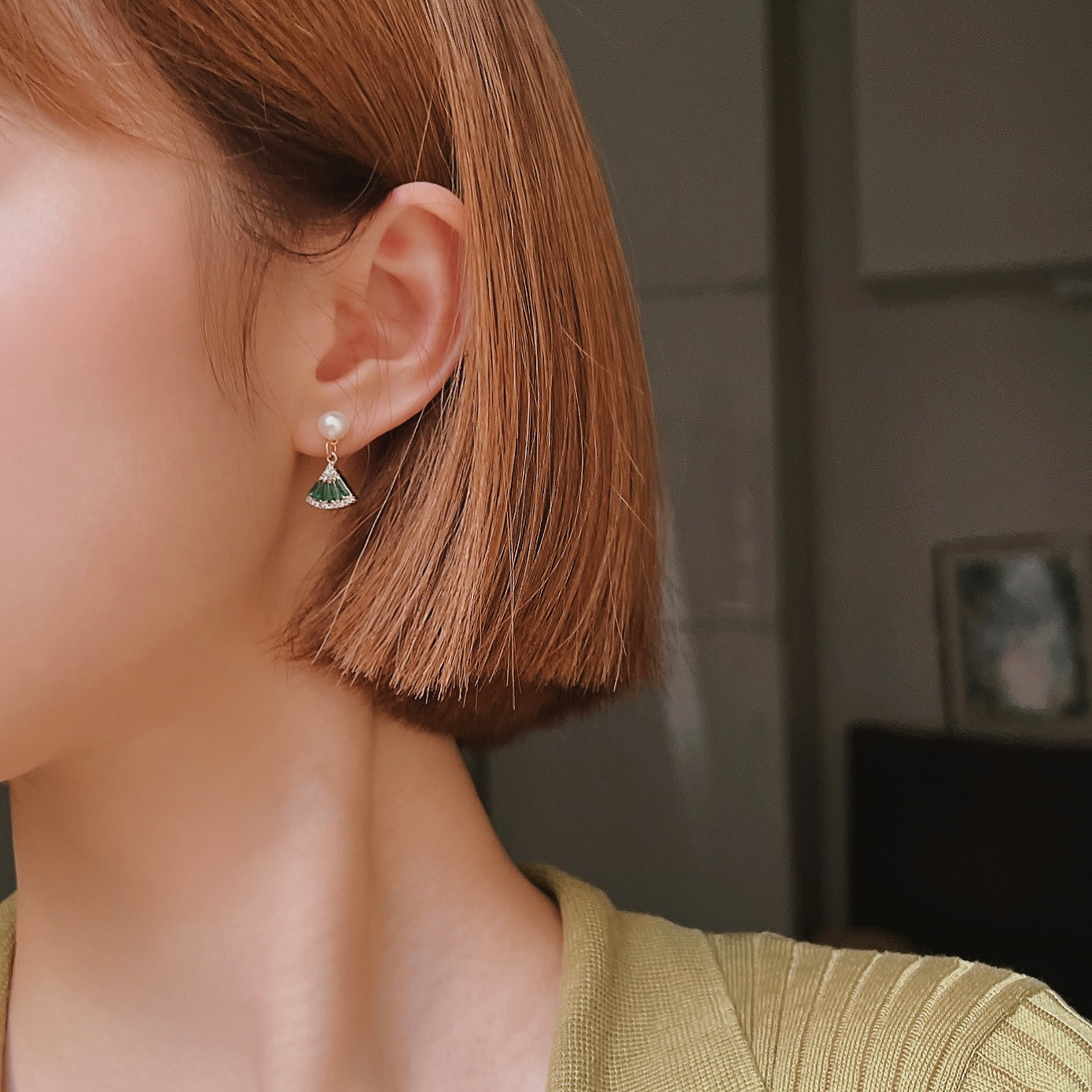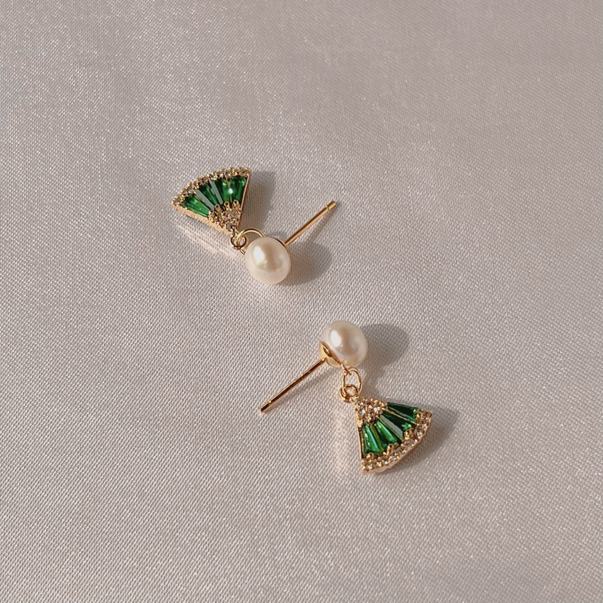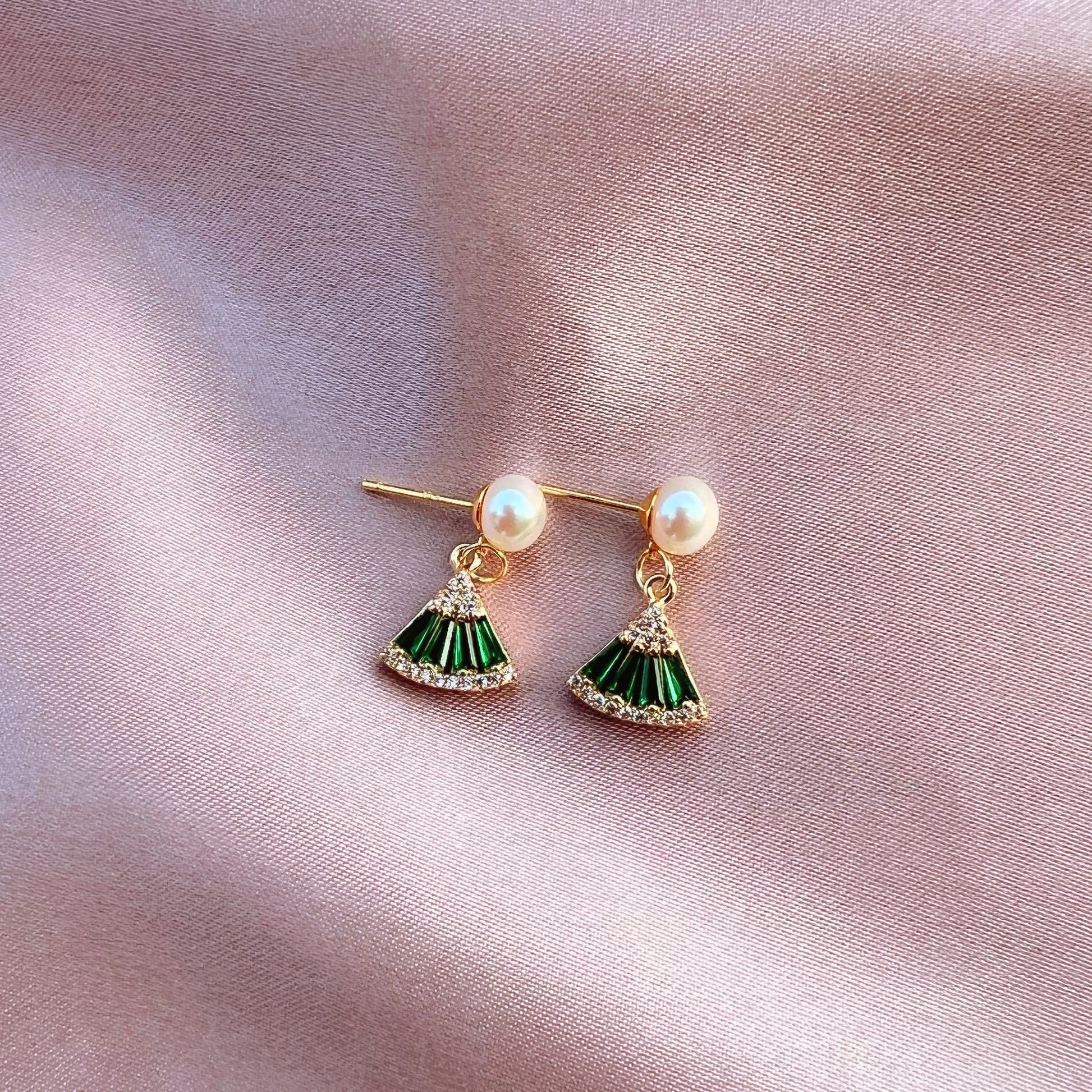 Unique design with natural pearl of 5-6mm and Fan-shaped green zircon, 925 silver pin, individual weight 1.5g