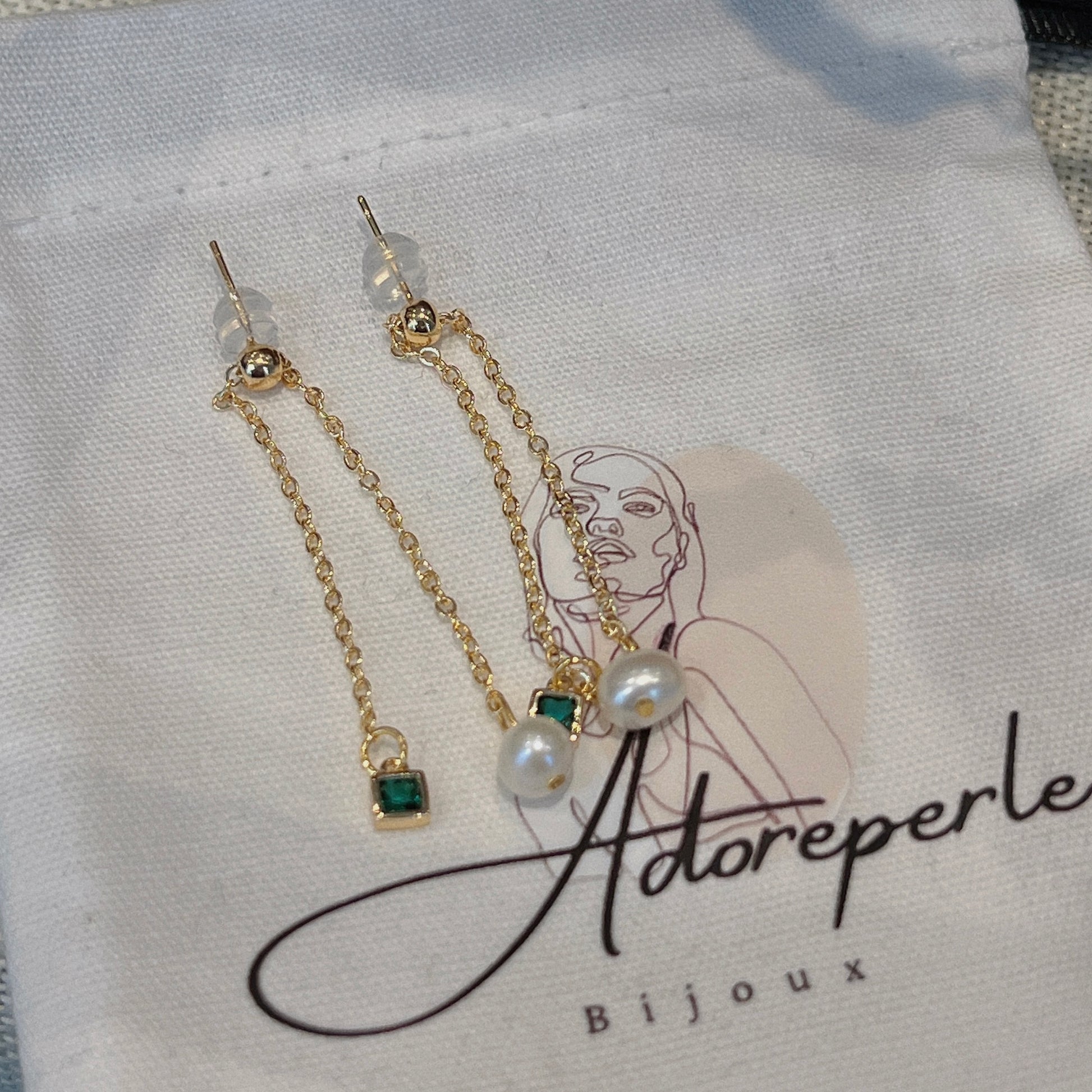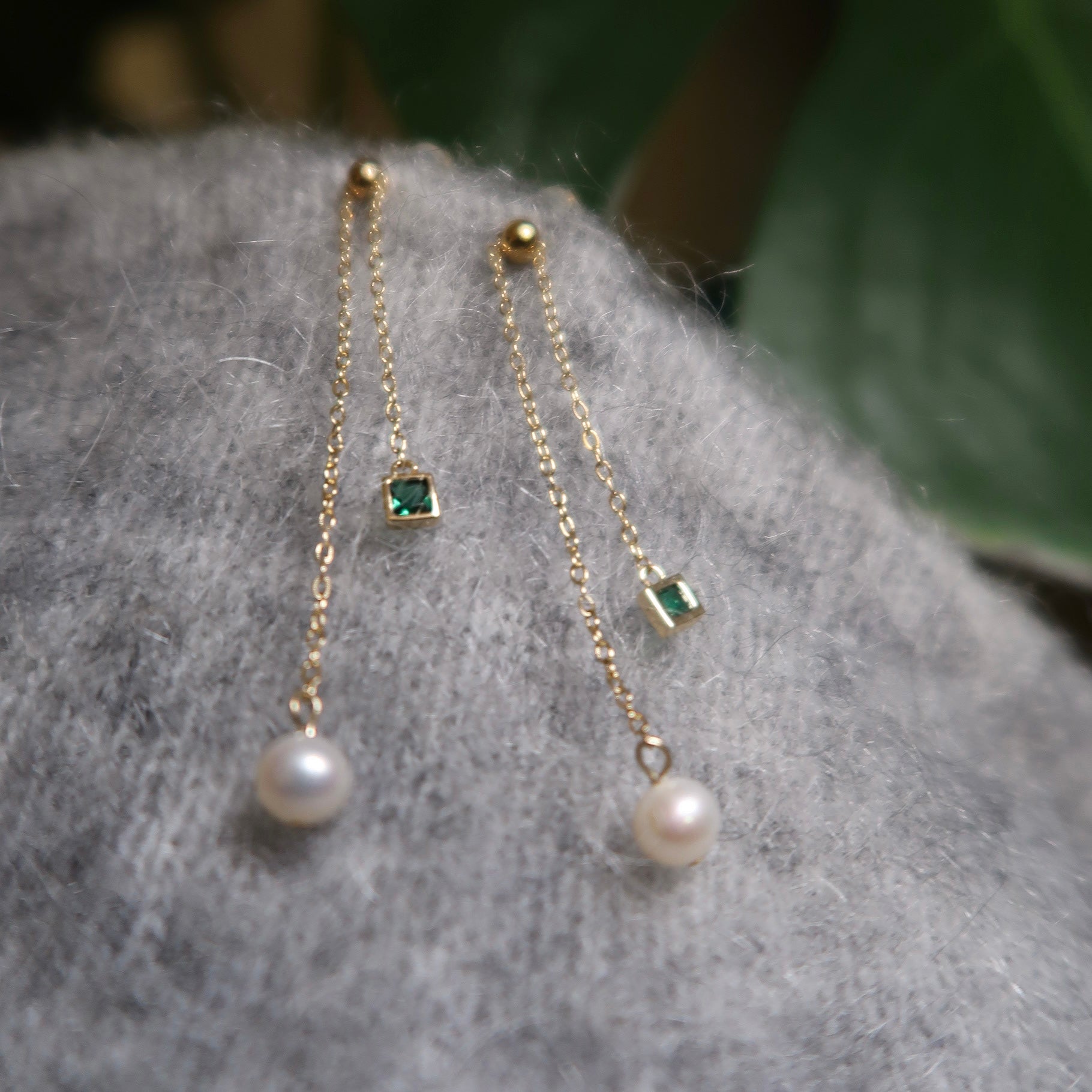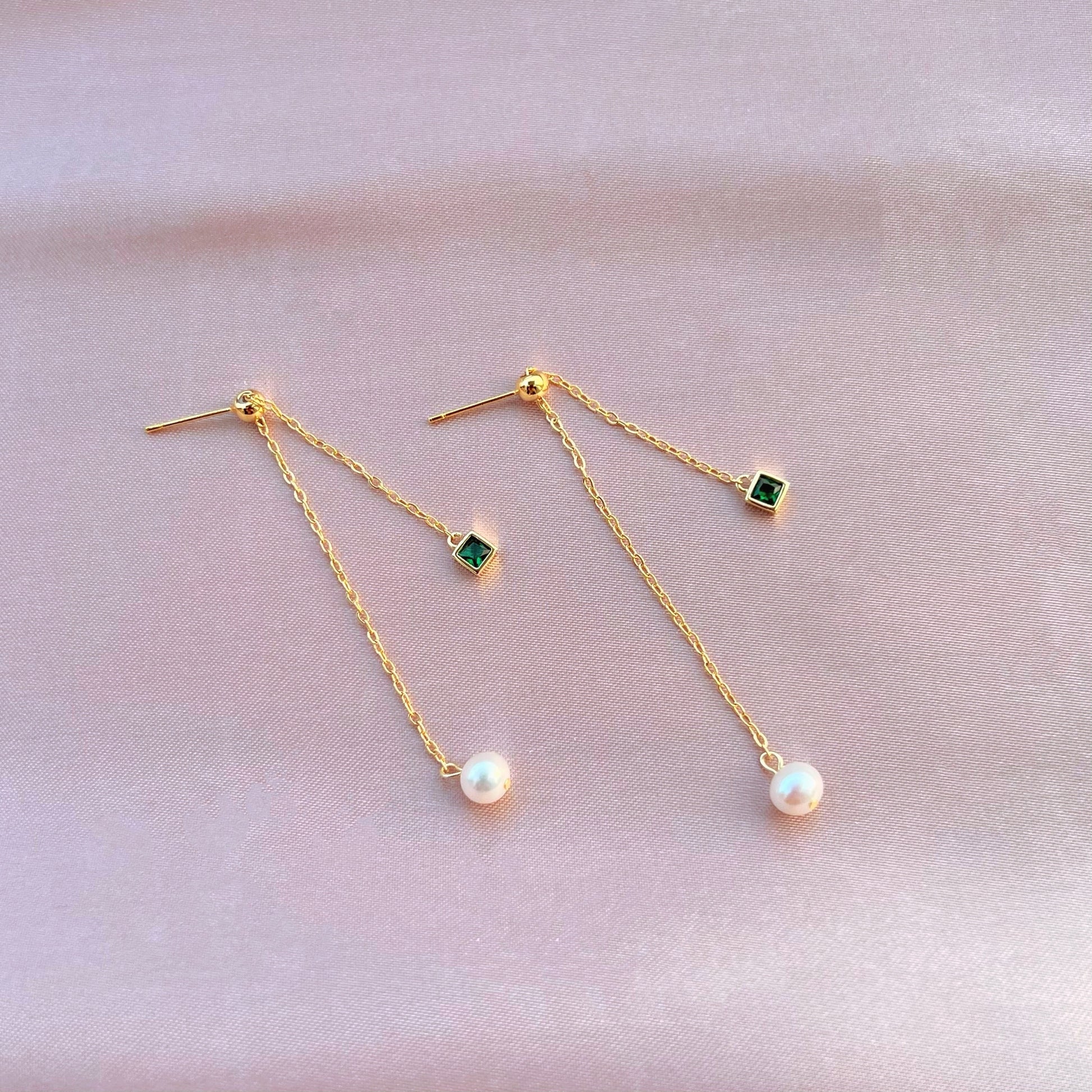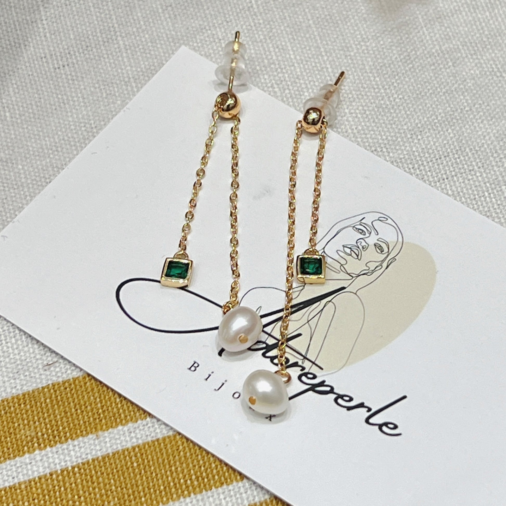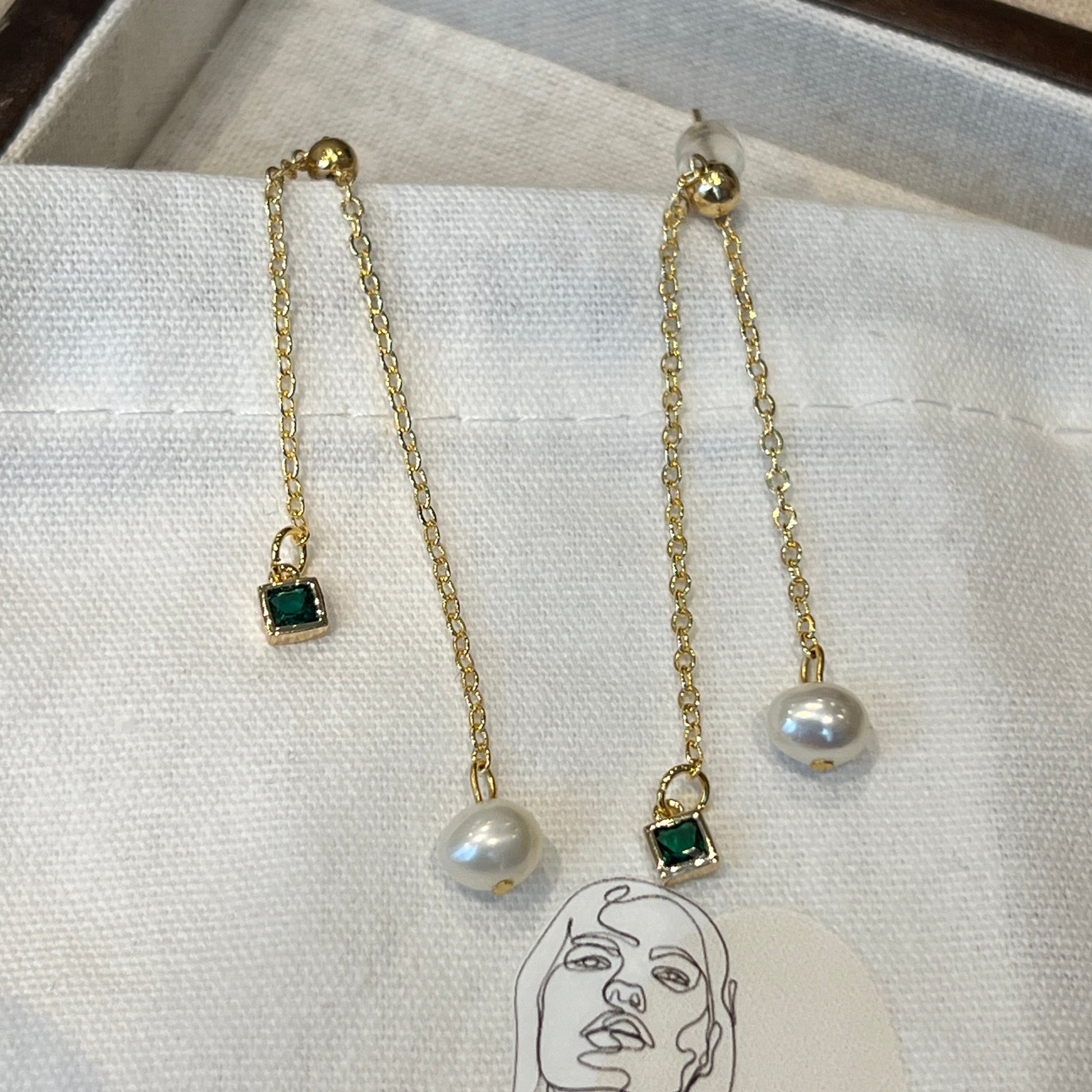 Unique tassel design with natural pearl of 5-6mm, gold clad green zircon, 925 silver pin, length 6cm, individual weight 2g