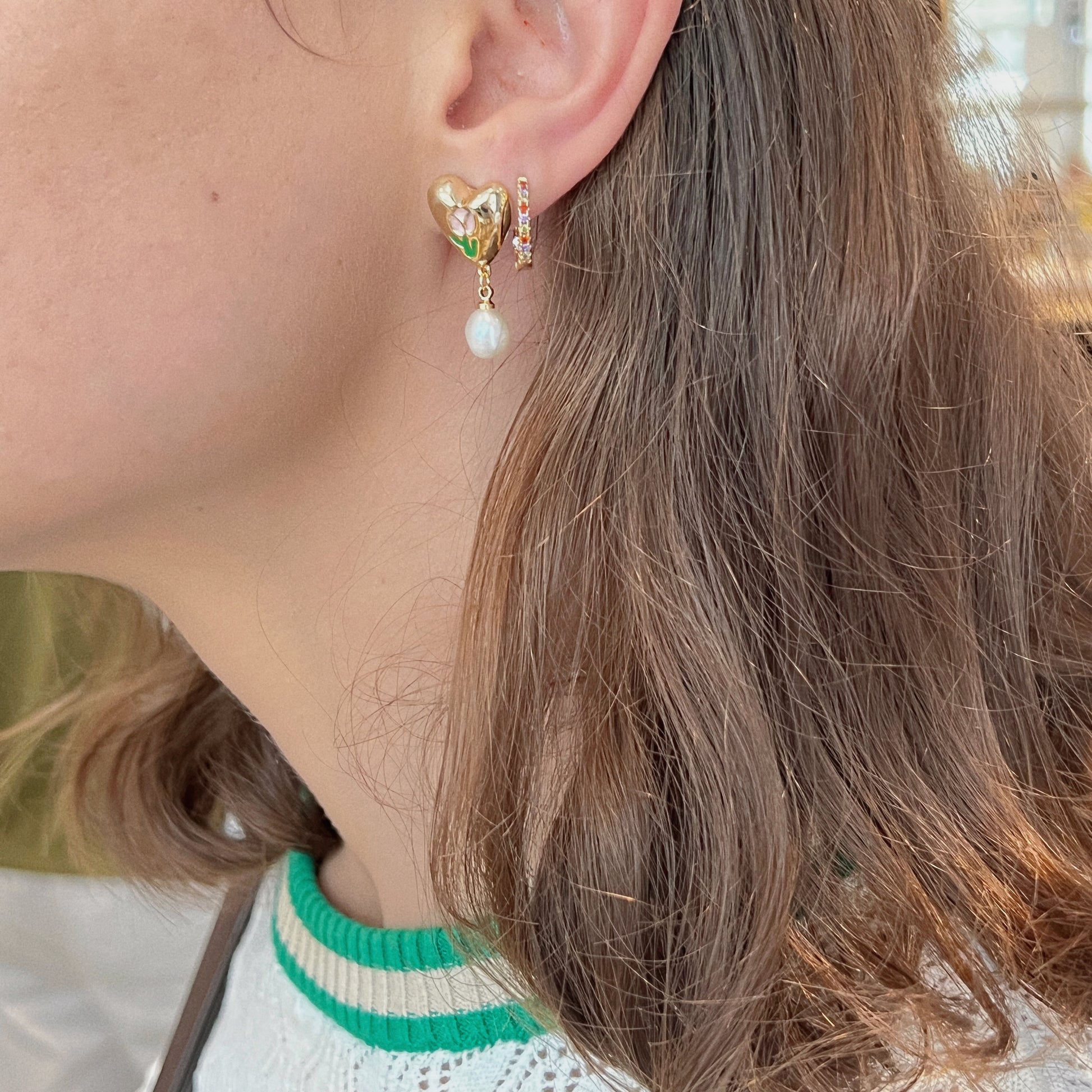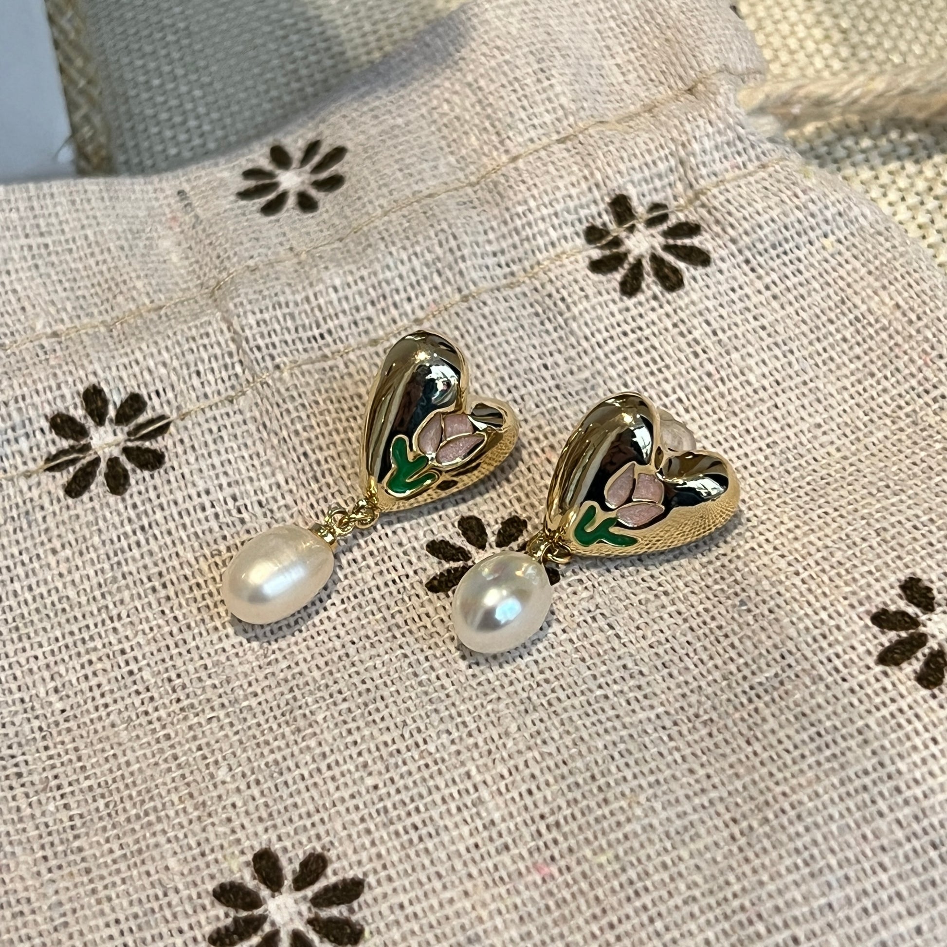 Unique design with natural pearl of 3-4mm and heart-shaped tulip pattern accessory in gold filled 18K, sterling silver material. Earring length 4cm and weight 5g.