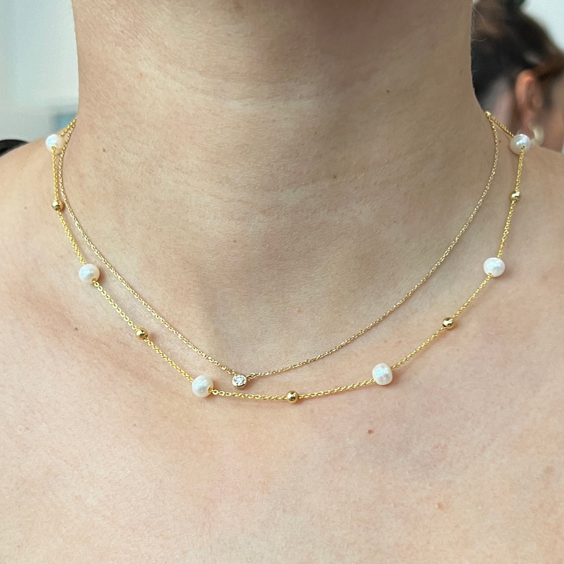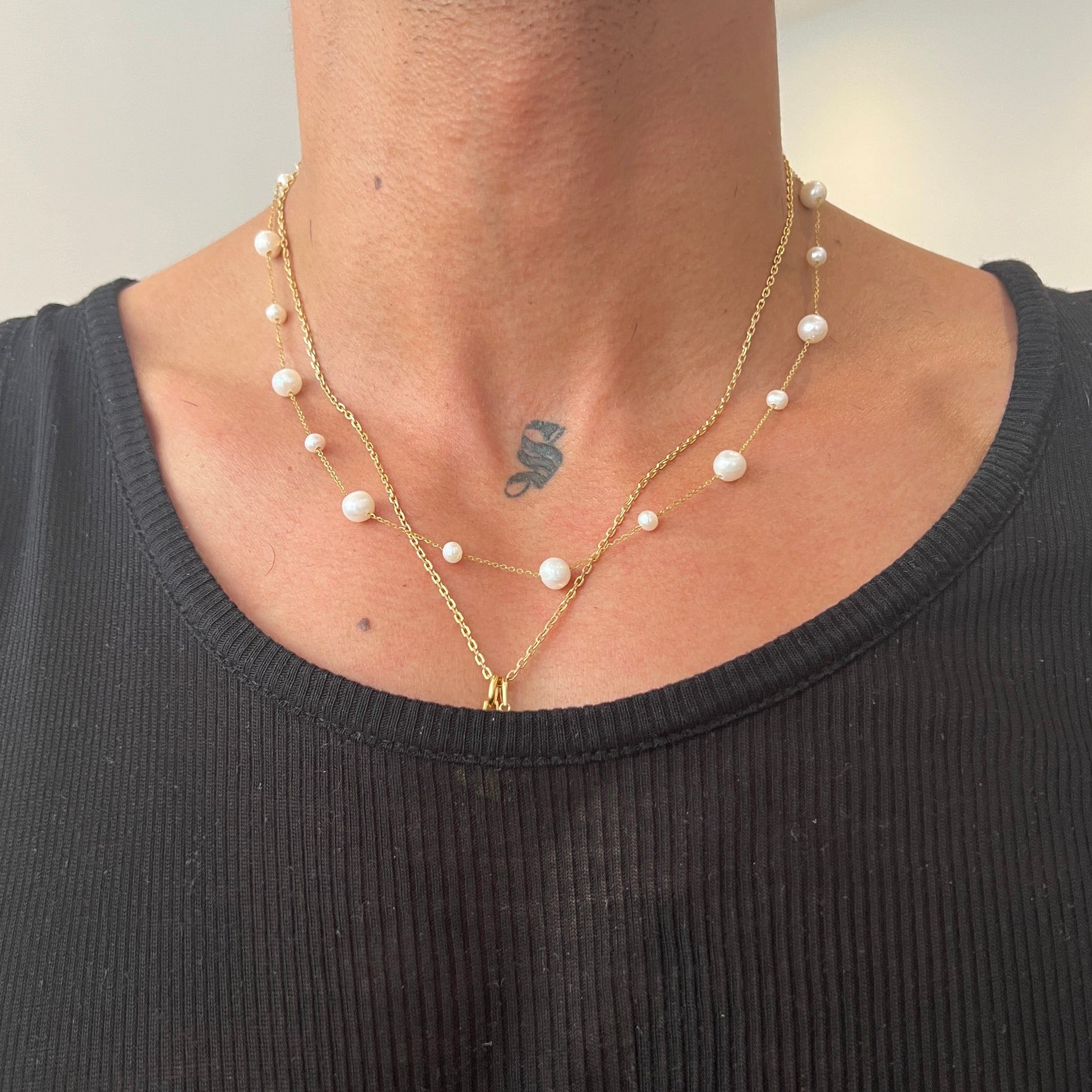 Unique and elegant design with 5-8 mm natural pearls and 18K gold plated on 925 silver chain, 50 cm long, adjustable necklace length.