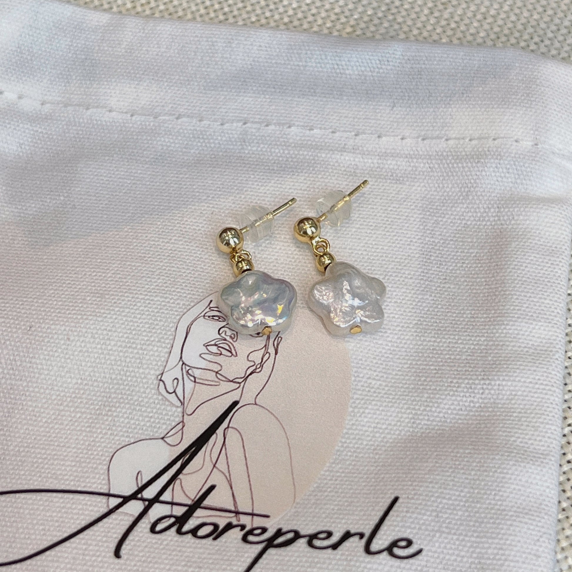 独特的设计,采用花形巴洛克珍珠和18K 镀金纯银材质。耳环长 2 厘米,重 2.3 克。
